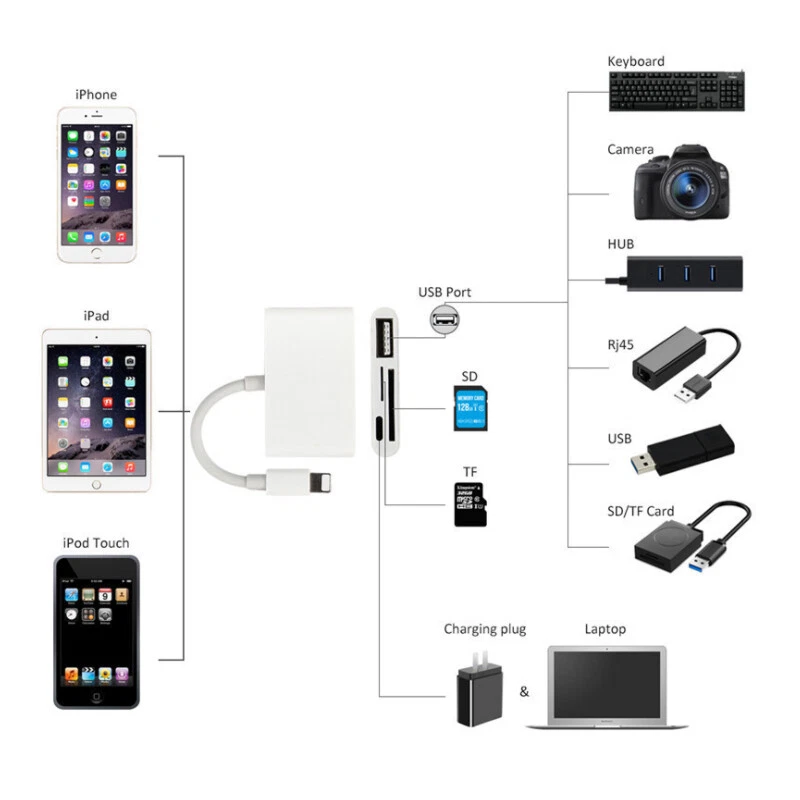 USB to Card Reader Adapter USB Camera Micro SD Memory Slot for iPhone iPad iPod Description: Through the 4 in 1 Audio Camera Connection Kit ,its incredibly easy to download photos from your digital camera to your iPad .It gives you two ways to import photos and videos.One is ti use USB cable ,the other is to read form SD/Micro SD card directly. The Connection Kit supports standard photo formats,such as JPEG and RAW etc. Besides,it supports PC keyboard input as well as imports photos form USB flash disk to iPhone/iPad/iPod Touch. Moreover,it allows you to charge iPhone/iPad/iPod Touch.via a micro USB cable. Specification: Operating Voltage:3.3V Operating current:<100mA Interface:L/SD Card/TF Card/USB Receptacle W/R Speed:USB2.0 Speed(14MB/S-16MB/S) Compatibility:Compatible with iOS 9.1 iOS 10 iOS 11 or later Please note: 1. The 4 in 1 Camera Connection Kit has 4 ports.However,USB port,SD port and Micro SD port can't be used at the same time.The port can be used together with any of above 3 ports.For example,you can charge iPhone/iPad/iPod Touch and put keyboard type at the same time. 2. If USB flash disk/Micro SD card/SD card directly use with this kit,you must create "DCIM" folder and named the pictures like for example you want to import pictures from your USB flash disk,you need to creat a file in your usb flash disk and named it "DCIM",then you need to copy your pictures to this folder and named them as after that you can plug in the adapter and import pictures to your phone. 3. This item can only transfer pictures and video from SD card to iphone/ipad. It is one-way transmission and can't transfer data from mobile phone to SD card. Package Include(Retail Packaging): 1 x 4 in 1 to Camera card reader 1 x User Manual Feedback: 1) Your Feedback is really important to us,please take a few seconds to leave great feedback if you are satisfied with our product or service, thank you so much! 2) We always offer the lowest price for best goods and service to you. 3) Please contact us before leaving neutral(3 stars) or negative(1-2 stars) feedback.We will try our best to solve the problem and leave you a happy shopping mood here. Thank you!