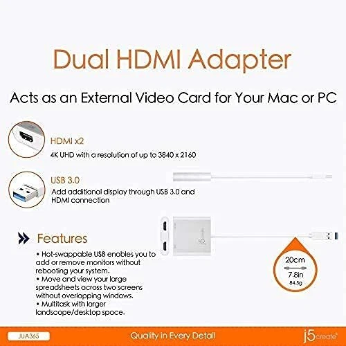 The JUA365 USB 3.0 to Dual HDMI Multi-Monitor Adapter acts as an external video card for your Mac or PC. It allows you to add an additional monitor/display through your USB 3.0 port. There's no need to open your computer to add an expensive video card. With the USB 3.0 to Dual HDMI Multi-Monitor Adapter you simply load the drivers, plug the adapter into the USB port, then plug in the HDMI monitor cable into the adapter and you are ready. The Adapter supports three viewing modes. Primary Mode allows you to have individual applications open on each monitor, vastly improving productivity. Extended Mode allows you to extend your desktop across multiple displays, which is great for spreadsheets. Mirroring mode is used to clone one screen onto another, which is ideal for presentations. With plug-and-play functionality between your computer and second monitor or projector, you will be able to create a new visual environment in seconds. In addition, has developed this compact design to cater to the sophisticated user who values function as well as elegance. ADD AN ADDITIONAL DISPLAY: Dual monitor adapter allows you to easily add an additional display through the USB-A 3.0 and HDMI connection. 【Note】 Driver installation is required, please refer to the user manual and driver download page. One of the HDMI ports can output resolutions up to 4K UHD (3840 x 2160), while the other can output resolutions up to 2048 x 1152 ADD AN ADDITIONAL MONITOR- All without needing to add an expensive internal video card! Note: Driver installation required for Mac users, please refer to the user manual and driver download page. HOT-SWAP: Hot-swappable USB enables you to add or remove monitors without rebooting your system MULTITASK WITH LARGER LANDSCAPE/DESKTOP SPACE: Ideal for viewing multiple windows at the same time