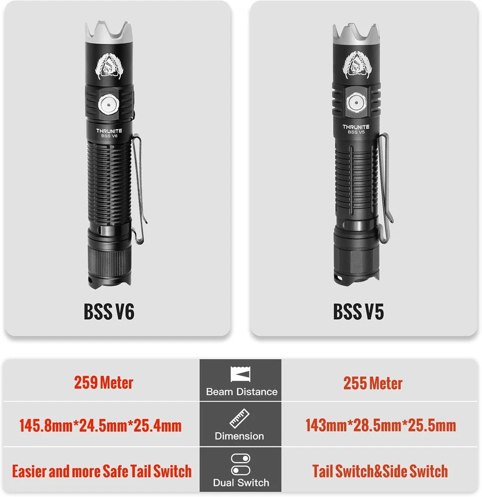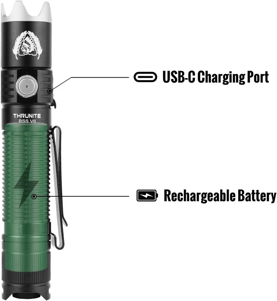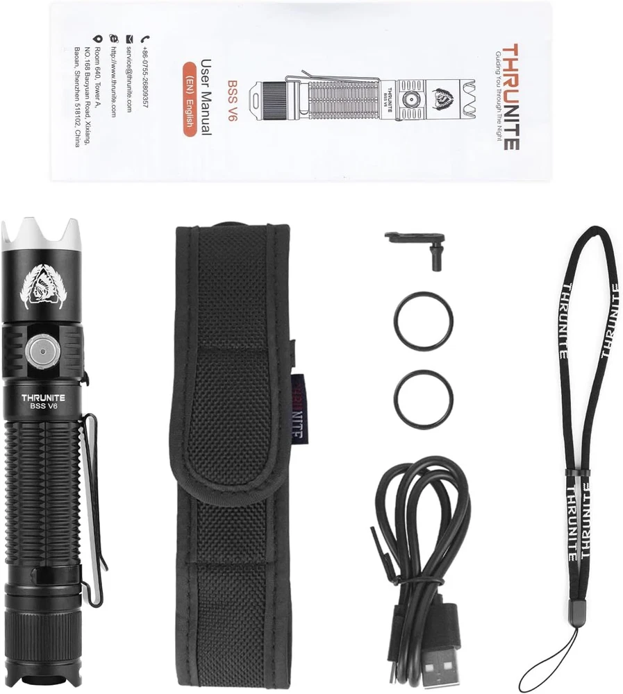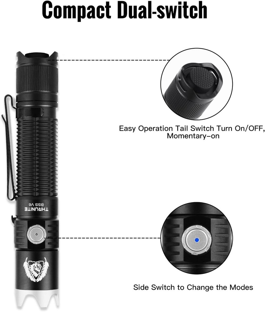 Product Description BSS V6 Black Scout Survival Customized Edition EDC Flashlight, USB-C Rechargeable LED Flashlight, High 2000 Lumens, 6 Light Modes, Dual Switches Bright Flashlights, Black - CW Powerful and Bright - BSS V6 Max 2000 Lumens flashlight high performance LED Bulb provides bright light, easily light up to 259 meters/ 283 yard.Powerful enough for everyday use, like dog walking, home security, emergency, camping, hiking. 6 Lighting Modes and Long Beam Distance - The handheld rechargeable BSS V6 has 6 lighting modes: Turbo, High, Medium, Low, Firefly, Strobe. Single click the tail switch to turn on/off the light, easier to use. Memory function makes it to restart at the last mode when you turn off the light. With high performance LED bulb, the rechargeable light can reach 259 meter ( 283 yards) , suitable for many indoor and outdoor activities. Compact Dual Switch - Tailcap switch provides fast access to important outputs for applications, Press the tail cap halfway to momentarily ACTIVATE the light for emergency using.The side switch is used to select 6 modes for daily use. Strobe mode is good as a law enforcement feature. Turn off the light with tail switch, never worry about the inadvertent activation in your pocket or bag. Rechargeable and LED indicator - The BSS V6 tactical flashlight powered by a rechargeable high power battery (included) max run time 41 days at firefly mode, connect to charge with included USB-C charging cable. 3 level battery indicator reminds you when to recharge the light.The charging port has a rubber seal for waterproof. Detachable Stainless Stell Bezel - Screw on the Bezel for emergency using or others unexpected situations. 2 way pocket clip allows it be attached to backpacks and pocket for easy access, or use the included holster or lanyard designed for Everyday Carry. About Us We are a reputable seller with many years of experience selling on eBay. Our goal is to provide high-quality products and excellent customer service. Shipping Items will be shipped within 1-3 business days when we received payment. (Orders are not processed on weekends & holidays) Tracking information will be sent once item is shipped. Delivery time depends on destination and other factors Item is shipped to ebay address. Leaving correct address can minimize delay. For international shipping and shipping to Guam, Hawaii and Alaska, Please contact us before placing the order. International buyers please note: Import duties, taxes and charges are not included in the item price or shipping charges. These charges are buyer’s responsibility. We will try our best to reduce the risk of the custom duties. Local pick-up is unavailable at the moment. Contact Us We reply any email messages within 1 business / working days(off-duty at weekend). If you do not get a response from us, then please check your junk or spam mailbox. Our Business hours: Mon-Fri 9:00-18:00, UTC/GMT +8 hours. Please contact us either by clicking "contact seller" in the "purchase history" section or simply click "ask a question" at the bottom of this page. If you are unsatisfied with our item or service, please contact us before leaving any feedback. We are committed to resolve all issues in a friendly and satisfactory manner.