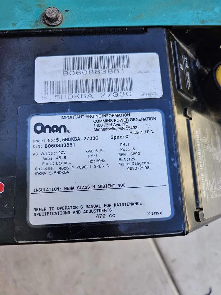 USED ONAN QUIET DIESEL 5500 RV GENERATOR, ONLY 106 HRS 5.5HDKBA-2733C Onan Quiet Diesel 5500 in perfect condition, only 106 hrs, been load tested. Came out of a Monaco diesel pusher. -PLEASE MAKE SURE THIS IS CORRECT PART FOR YOUR VEHICLE -PLEASE CHECK PHOTOS FOR CONDITION -YOU WILL GET WHAT YOU SEE ITEM CONDITION: ALL OUR PARTS ARE TESTED BEFORE BEING REMOVED FROM THE VEHICLE. IT HAS NORMAL WEAR OF USE BECAUSE IT IS A USED PART. PLEASE NOTE THAT ALMOST ALL ITEMS WE SELL ARE USED, IF YOU BOUGHT AN ITEM AND IT DOESN'T MATCH OR IT IS DEFECTIVE, PLEASE CONTACT US FIRST BEFORE LEAVING FEEDBACK, WE WILL RESOLVE ANY ISSUES. WARRANTY: MOST PARTS WE SELL THROUGH EBAY MOTORS COME WITH A 30-DAY MONEY-BACK OR EXCHANGE GUARANTEE. ( READ MORE IN OUR STORE POLITICS) THE 30 DAY PERIOD STARTS WHEN YOU TAKE POSSESSION OF THE PART. IF YOU HAVE ANY ISSUES WITH THE ITEM OR SERVICE PLEASE LET US KNOW SO WE CAN WORK IT OUT. GOOD SERVICE AND POSITIVE FEEDBACK ARE IMPORTANT TO US. IF YOU PURCHASED PART BY MISTAKE / CHANGED YOUR MIND OR IT DOES NOT FIT YOUR VEHICLE, WE WILL REFUND YOUR MONEY. NO LABOR WARRANTY IS PROVIDED. OUR SHOP WILL NOT BE HELD RESPONSIBLE FOR ANY DAMAGES THAT OCCUR ON THE BUYER'S VEHICLE DURING INSTALLATION OR USE OF ANY PART. SHIPPING POLICY: MOST OF THE SMALL-MEDIUM PARTS WILL BE SHIPPED SAME DAY IF ORDER HAS BEEN PLACED BEFORE 2PM PT. ANY ORDERS PLACED AFTER 2PM PT WILL BE SHIPPED NEXT BUSINESS DAY, EXCEPTIONS ARE OVERSIZED & FREIGHT ITEMS. LARGE ITEMS SUCH AS HOODS, DOORS, BUMPERS, TRUNK LIDS, ENGINES, TRANSMISSIONS, AND OTHER BULK ITEMS ARE SHIPPED VIA FREIGHT AND MAY REQUIRE A BUSINESS ADDRESS FOR DELIVERY. IF EBAY SHOWS YOU THAT THERE IS NO DELIVERY TO YOUR STATE OR COUNTRY, WRITE TO US, WE WILL TRY TO SOLVE THE PROBLEM. RETURN POLICY: IF THERE IS ANY QUESTIONS ABOUT THIS PRODUCT OR YOU NEED TO RETURN IT, PLEASE DO NOT HESITATE TO CONTACT US VIA EBAY MESSAGE BEFORE YOU LEAVE NEGATIVE FEEDBACK OR OPEN A RETURN REQUEST. WE OFFER A 30-DAY RETURN POLICY ON ANY REASON, SUBJECT TO EBAY'S RETURN POLICY. WE ARE NOT RESPONSIBLE FOR ANY LABOR FEE ASSOCIATED WITH THE INSTALLATION OR REMOVAL. IF WE RECEIVED A RETURN AND NOTICED THAT THE ITEM WAS OPENED, OR FOUND DAMAGE THAT WAS NOT THERE, OR THE BUYER SENT US A DIFFERENT PRODUCT OR SIMILAR PRODUCT, BUT WITH A DIFFERENT PART NUMBER- WE ARE ENTITLED TO DEDUCT UP TO 50% ON A REFUND, ACCORDING TO THE EBAY SELLER PROTECTION POLICY. FEEDBACK AND RATING: DEAR CUSTOMERS, WE ALWAYS EXPECT TO HEAR ONLY POSITIVE FEEDBACK! IF YOU ENCOUNTER AN ISSUES WITH ONE OF OUR PRODUCTS, PLEASE CONTACT US BEFORE LEAVING A NEGATIVE FEEDBACK OR OPENING A CASE. WE ARE HERE TO HELP RESOLVE ANY PROBLEM. WE STRIVE FOR EXCELLENT CUSTOMER SERVICE AND WANT TO ENSURE THAT EVERYONE IS A SATISFIED, RETURNING CUSTOMER! WE THANK YOU FOR YOUR TIME AND FOR CHOOSING US AS YOUR SELLER. WE WILL BE GLAD TO RECEIVE YOUR FEEDBACK!
