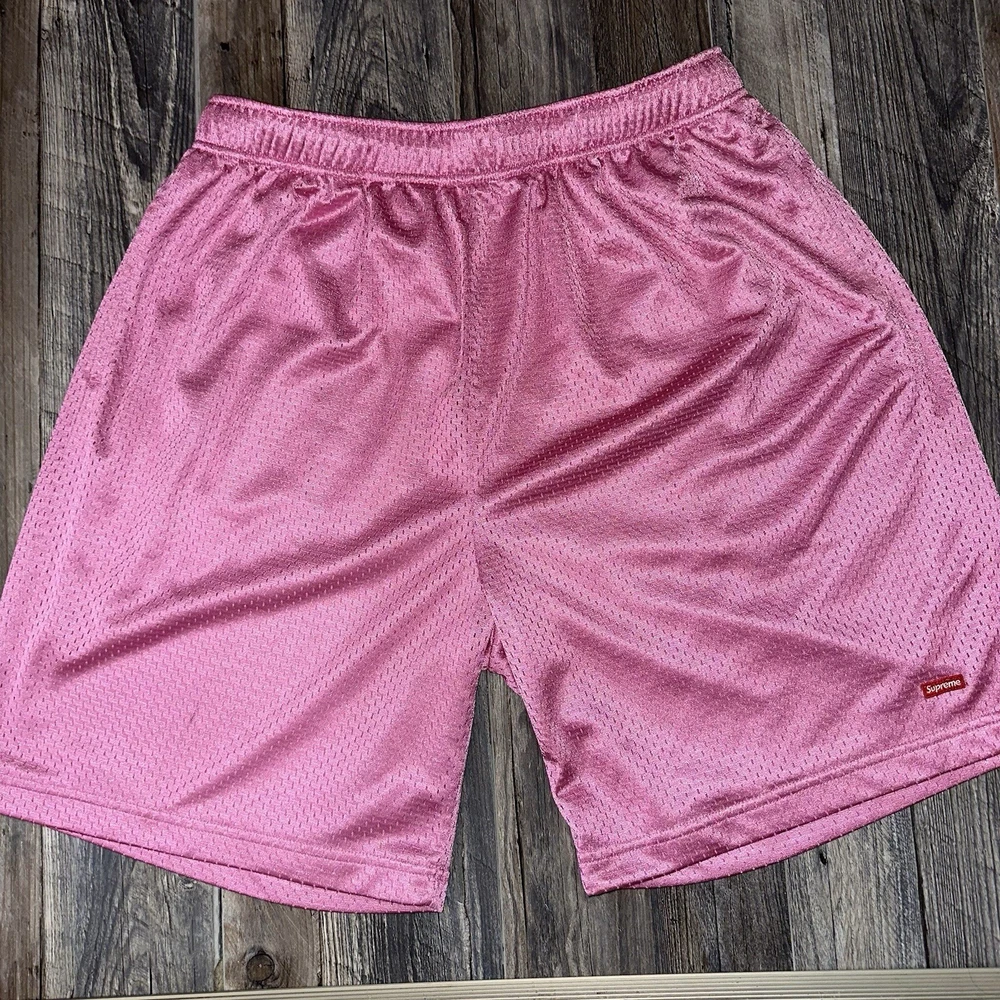 Front Type:Flat FrontColor:PinkMaterial:PolyesterClosure:DrawstringFabric Type:MeshWaist Size:32 inBrand:SupremeStyle:SweatCountry/Region of Manufacture:ChinaSize:MCharacter:SupremeFeatures:PocketsVintage:NoFit:RelaxedFabric Wash:MediumOccasion:Casual, TravelPattern:SolidAccents:Embroidered, LogoDepartment:MenSeason:Fall, Spring, SummerSize Type:RegularTheme:90s, Hip Hop, Retro, Sports, Designer, Logo