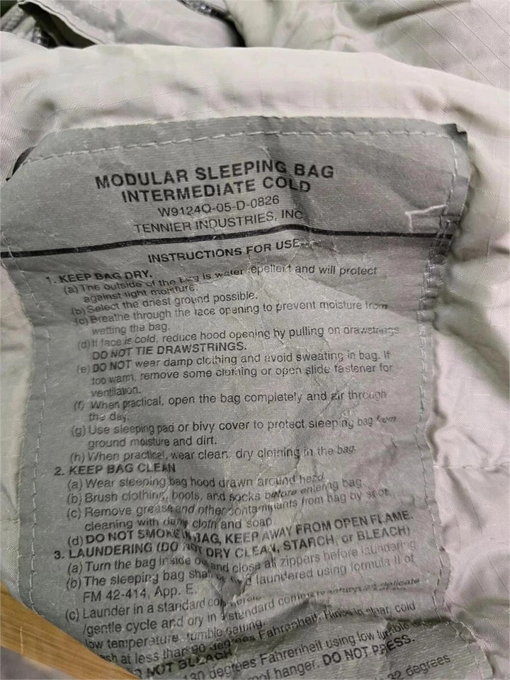 All items in this listing are US military surplus. They may have wear and stains consistent with general use, unless otherwise noted or shown. Each sleeping bag will include a 'stuff sack' for storage and carrying. The stuff sacks may also be worn or have small rips—see pictures for details. Does NOT include a bivy cover or other items, this is ONLY for the intermediate cold sleeping bag What is included in this listing will be shown in the pictures. If you do not see an accessory in the pictures and it is not specifically listed as included in the condition description or the listing description, the accessory is not included. Please read the descriptions completely for exceptions on this.