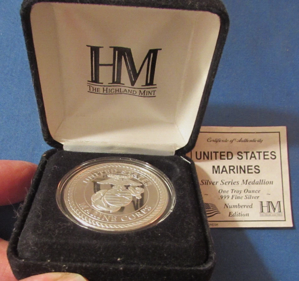 USMC UNITED STATES MARINE CORPS 1 OZ 999 FINE SILVER ROUND -- HIGHLAND MINT -- LIMITED EDITION NUMBER 1708 -- COMES WITH PRESENTATION CASE & COA ( CERTIFICATE OF AUTHENTICITY ) CONDITION IS EXCELLENT -- --- ANY QUESTIONS PLEASE EMAIL US
