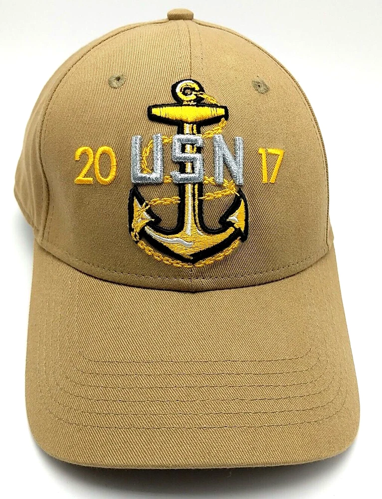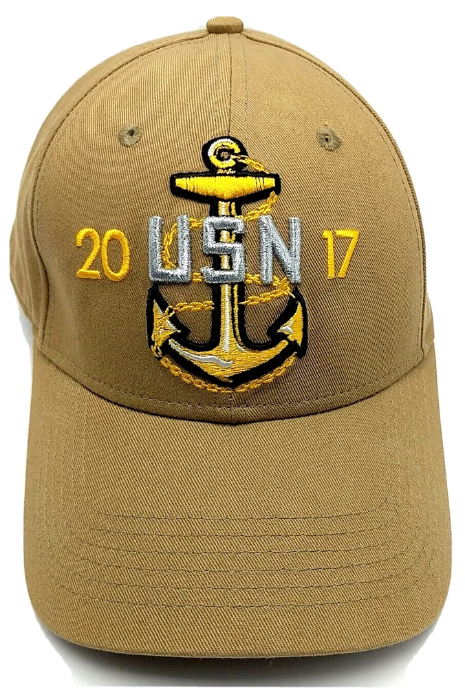 This is a nice 2017 U.S. NAVY CPO PRIDE DAY brown adjustable hat / cap Features: - "USN 2017" embroidered on front - "Honor the Anchor, Treasure the Legacy." embroidered on back - Slightly curved brim - Adjustable strap fits most heads Condition notes: Good overall condition. Clean inside and out. Washed and ready to wear. Please see the photos for more details. I pack carefully and ship quickly. Have any questions? Please ask.