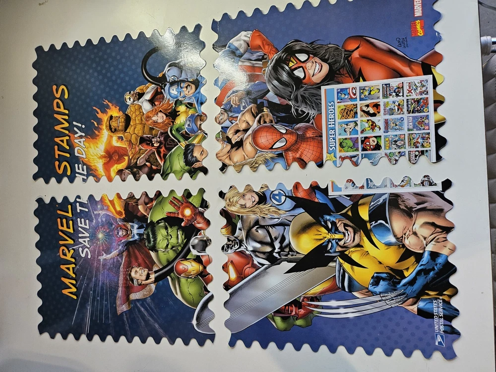 This is a rare and collectible set of four USPS promo stamps featuring Marvel characters and artwork by Greg Land. The stamps were released in 2007 and are part of a puzzle series. They are in excellent condition and are a must-have for any Marvel fan or stamp collector. The stamps feature some of the most iconic Marvel characters and are a great addition to any collection. Don't miss out on this opportunity to own a piece of Marvel history!