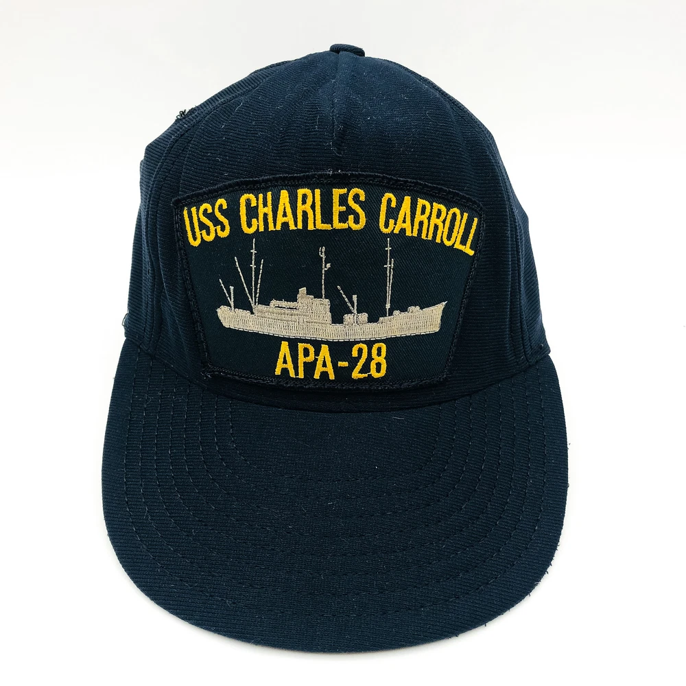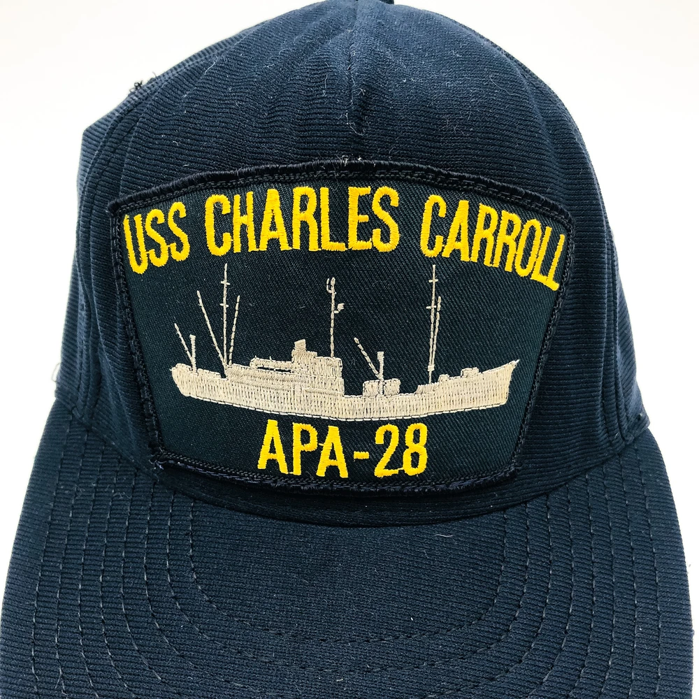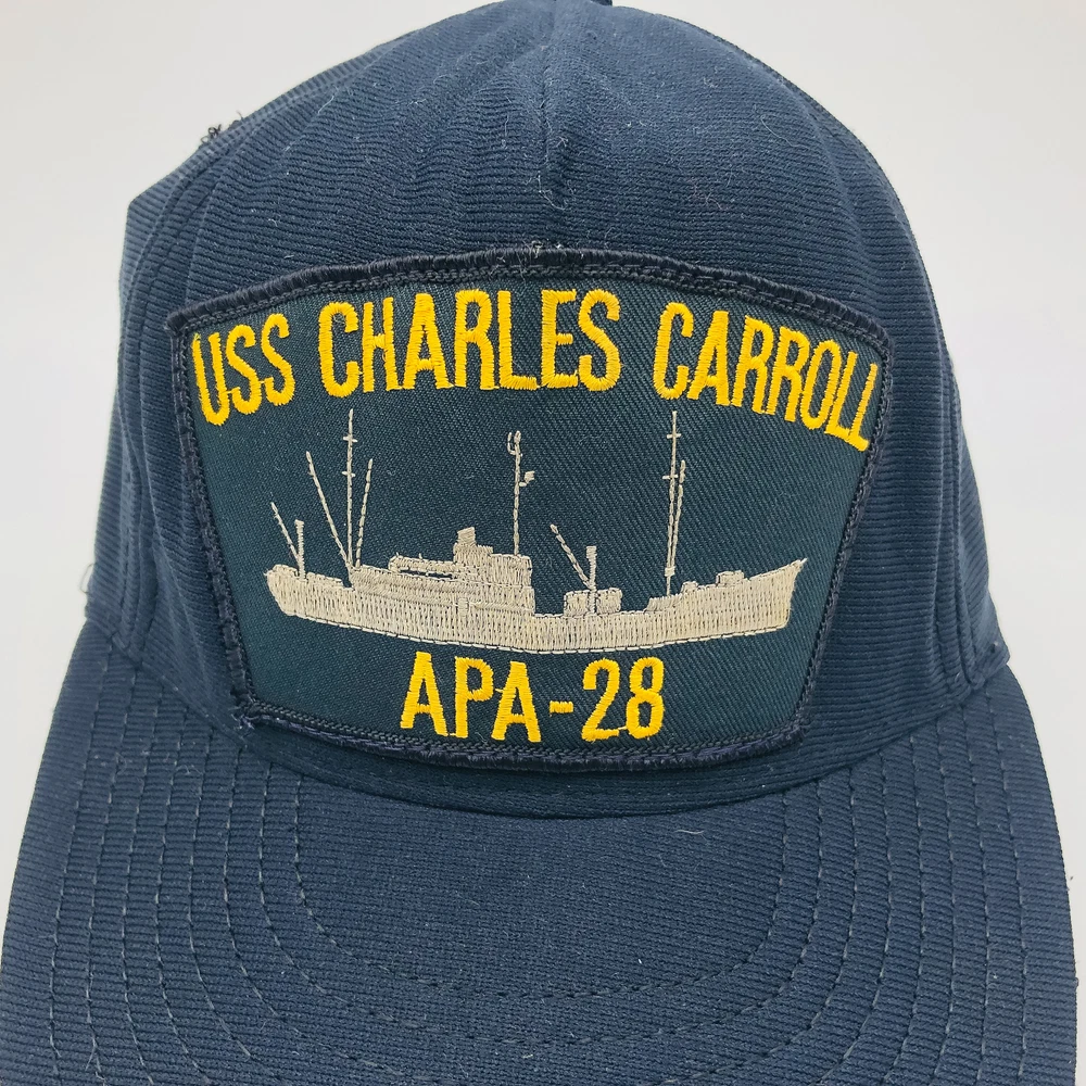For sale is a Vintage US Navy Ship Hat Cap Snapback USS Charles Carroll APA-28 WW2 Veteran in Used condition. Product Details Condition Notes: Unsure of hats age, but was worn by WW2 veteran post-WW2. Snapback is stamped Made in USA and tag reads Made in USA. One of the eyelets (little holes) is worn and unraveled. Hat has a few spots/marks/discoloration. Underside of the crown is threadbare. Hat still holds shape, but is starting to loosen and collapse when not worn. Please see photos. Additional Details: About Us We are a small business based out of Ohio. We love selling all things vintage and collectible. We also offer high quality business and industrial products at incredibly low prices. If you have any questions, we would love to hear from you! Thank you for visiting our store! - The HKResale Team (Holly, Kyle, Jason, Nate & Aly) Shipping We ship orders the same day (if ordered before 8AM) or the next business day (M-F). Our shipping department takes pride in their work, they want you to be wowed by the unboxing experience. Each item is carefully packaged to ensure it arrives to you safely. We gladly offer combined shipping on all items in our shop . To get started, just send us a message using the "Contact Seller" button on this listing. All of our items come from our warehouse located in Wadsworth, Ohio 44281. Contact Our customer service hours are Monday through Friday from 8:00 a.m. to 5 p.m. (EST) . We communicate through eBay's messaging system, but can also be reached at the number provided on the listing. Returns Customer satisfaction is our #1 priority! We offer 30-Day Free Returns on ALL of our items. If you are not completely satisfied with your purchase, please contact us to return your purchase within 30 days of receiving your item. Returned products must be in the same condition that you received, and must not be altered in any way. They should also include the original box and/or packaging with all tags included. Once your return is received and inspected by HK Resale (usually within 24 hours of receipt), your refund will be processed and a credit will be applied to your credit card or original payment method. Please note that depending on your credit card company, it may take an additional 2-10 business days after your credit is applied for it to be posted to your account. Please note that our warranty does not cover shipping charges TO the customer , unless you purchased a product with Free Shipping.