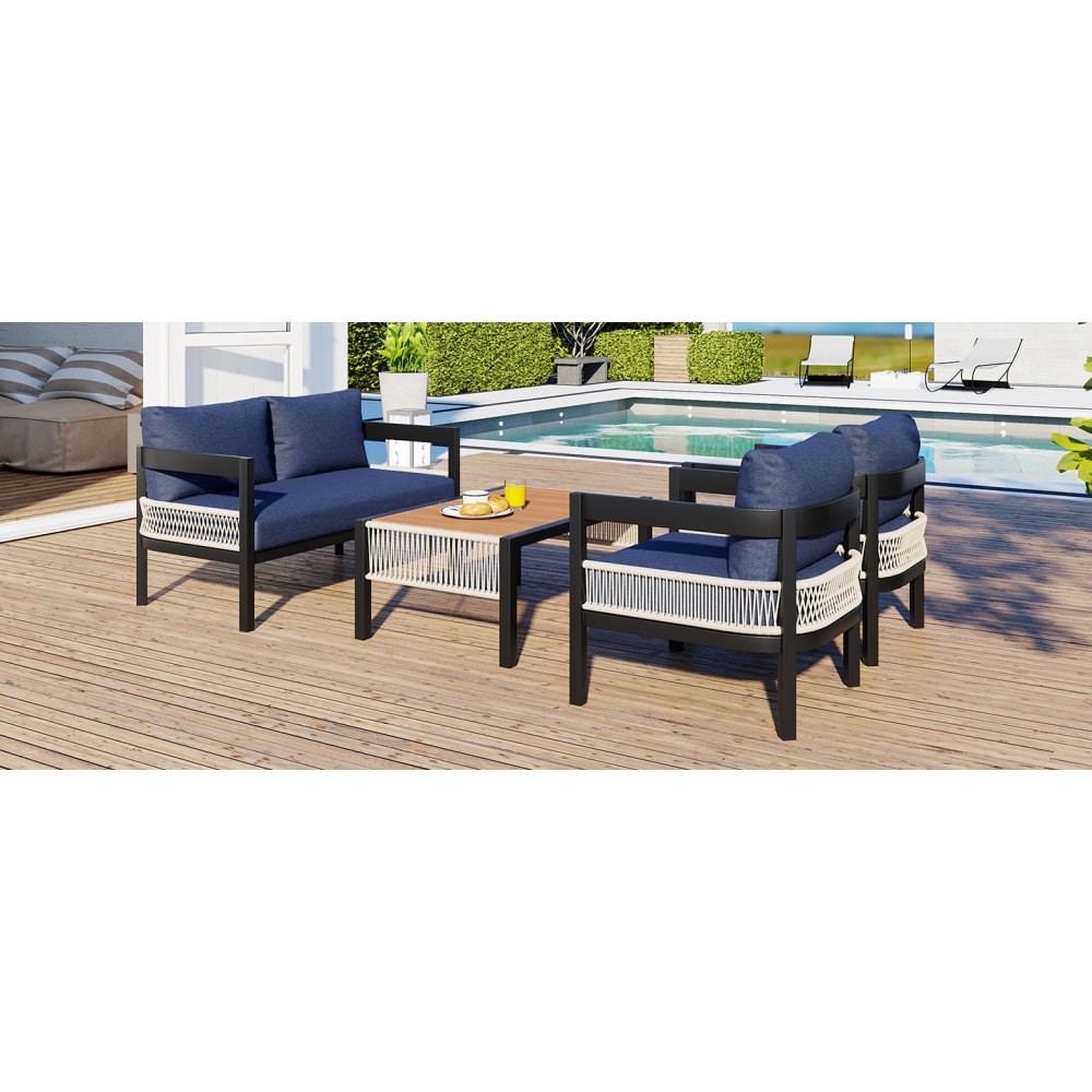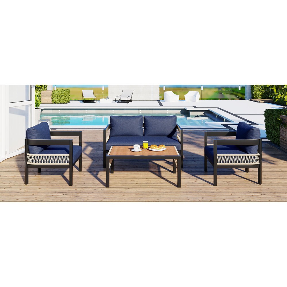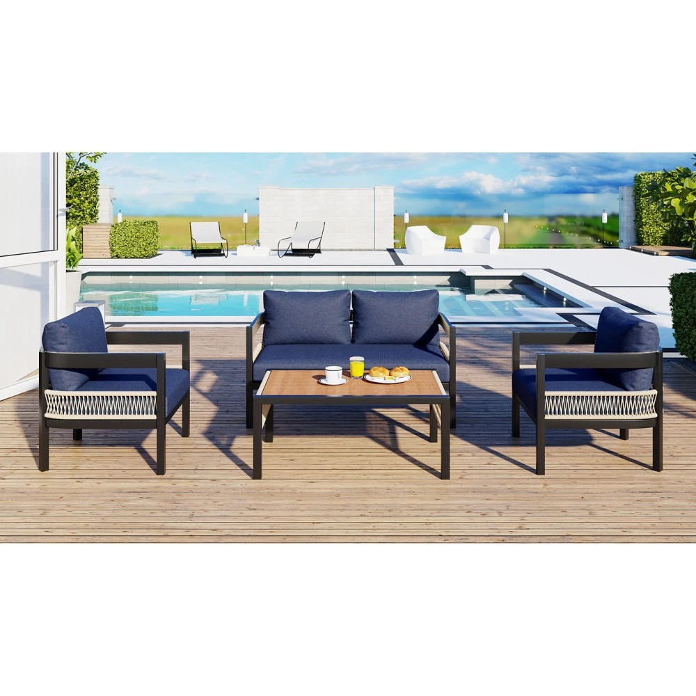 [Freedom to Combine, Enjoy the Outdoors]: Double and single seats can be flexibly matched to create a comfortable leisure space. Convenient small table, easily accommodate drinks, books and decorations, meeting various needs for outdoor relaxation and gatherings, allowing you to fully enjoy your leisurely moments. [Durable PE Wicker]: The backrest and armrests are woven from high-quality PE wicker, featuring a fine texture that is mold-proof, water-resistant, weather-resistant, UV-resistant, and wear-resistant. The design mimics the texture of natural rattan, combining natural beauty with a comfortable experience. [Eco-Friendly Material]: The tabletop is made from environmentally friendly wood-plastic composite board, offering waterproof and moisture-proof properties, free from pollution, and recyclable. It combines the texture and grain of natural wood with the dual performance of wood and plastic, making it a new eco-friendly alternative to traditional materials. [Sturdy Iron Frame]: Crafted from high-quality iron and enhanced with reinforced anti-rust technology, it withstands wind and rain, remaining as good as new over time. The sturdy load-bearing design effortlessly handles daily wear and tear, providing you with a safe and reliable experience. [Versatile for Multiple Scenes]: Available in beige, grey and dark blue, the minimalist modern design seamlessly fits various settings such as courtyards, terraces, and villa gardens. Paired with greenery or string lights, it effortlessly creates a high-end outdoor leisure space, suitable for all seasons, allowing you to fully enjoy comfortable moments. [Easy Assembly]:With straightforward instructions and provided hardware, this set can be quickly and effortlessly assembled. Weights & Dimensions Table Size 35.4''x22''x17.3'' Double Seat Sofa Size 45.3''x27.4''x33'' Single Chair Size 23.7''x27.4''x33'' Cushion Height 5.51'' Double Seat Net Weight 47.3 lbs Single Chair Net Weight 23.6 lbs Table Net Weight 41.8 lbs Overall Weight 136.4 lbs Specifications Table Material PVC Board Frame Material Iron Cushion Material Staple Fiber Cushion Filling Material Sponge + Soft Sponge Back Cushion Filling Material PP cotton Table Top Weight Capacity 100 lbs Sofa Weight Capacity 250 lbs Supplier Intended and Approved Use Residential Use Country of Origin China Installation Precautions Tips 1 It is best to lay cardboard on the ground before installation to avoid staining or scratching the product. Tips 2 Try to avoid friction between product partes during installation, otherwise it may cause scratches that are difficult to remove. Tips 3 Do not tighten the screws 100% too early. Notice About Color Due to screen display or light problems, the color of the products received may be slightly different from the pictures, Please refer to the actual product for the actual color. About Size Sizes are measured manually, there will be some slight differences.