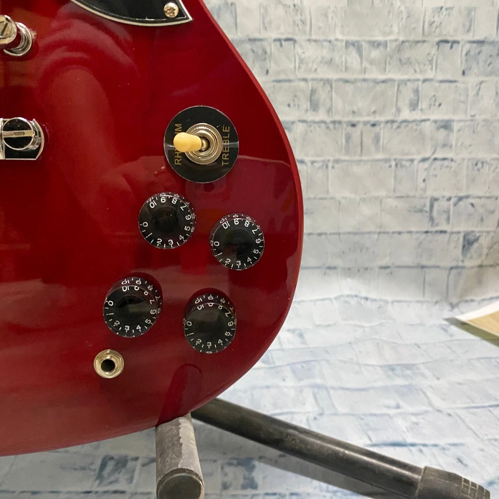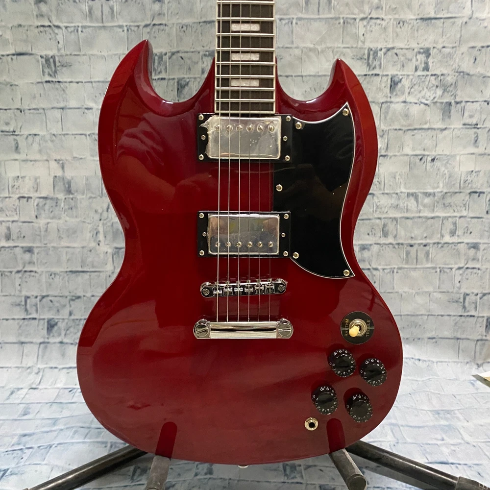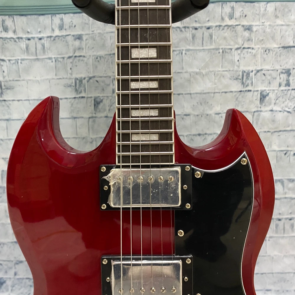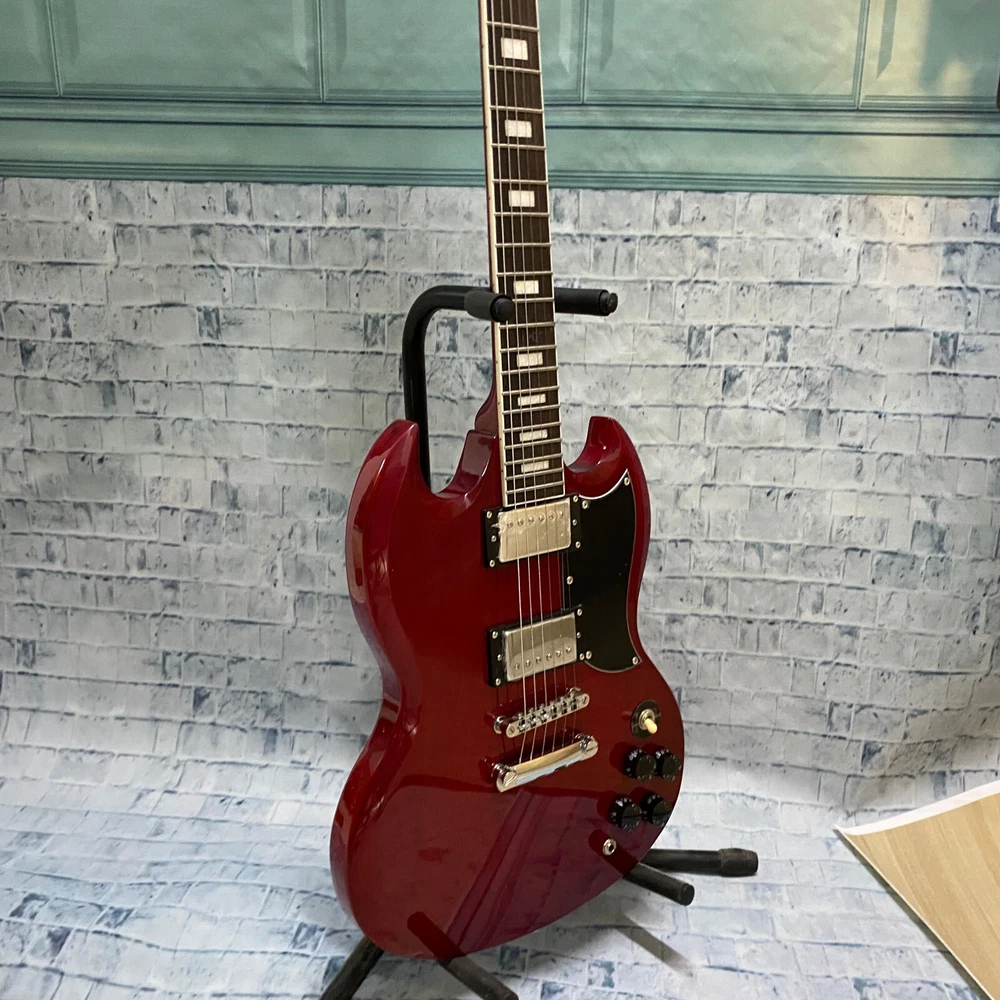 This is a professional-level SG electric guitar in metallic red with a solid mahogany body and mahogany neck. It has 22 frets on a rosewood fretboard, featuring chrome hardware. The set includes a cable, and it is a 6-string right-handed electric guitar from the 2024 Custom series, made in China.
