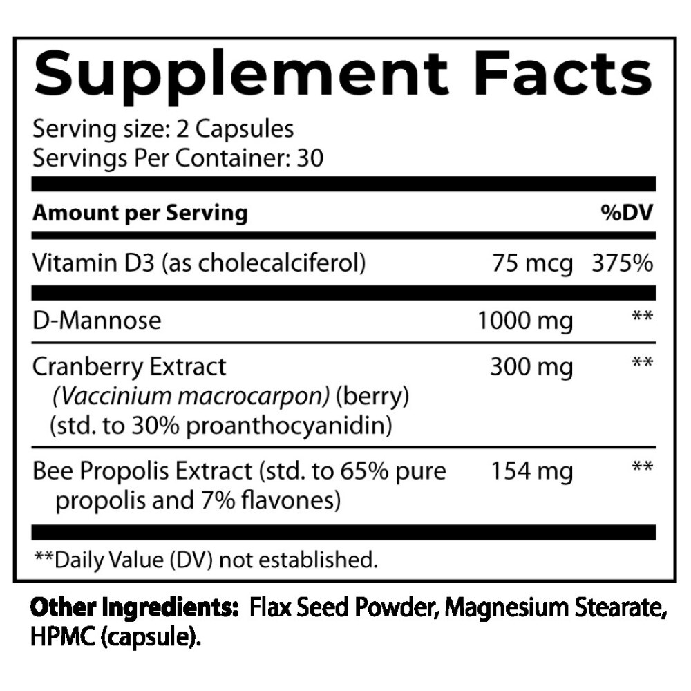 Product Overview D-Mannose with Cranberry + Propolis and other ingredients are well known to be very powerful and effective ingredients. D-Mannose 1000mg capsules with 300mg cranberry extract help maintain and control women's urinary tract health. This condition is not uncommon in men as well, but for women, these UTI capsules are a must-have. UT Fix Formula, a UTI supplement for women, is a long-term control method for improved health and peace of mind. Our D-Mannose capsules help relieve discomfort, reduce endless nighttime trips to the bathroom, and maintain and preserve better urinary tract health. The Cranberry D-Mannose Propolis blend is considered the easiest way to deal with any further bladder control issues while flushing your UTI out of the system. No more sleep interruptions or unnecessary pain - enjoy a better quality of life, because everyone deserves it. UT FIX by PureHealth Research is developed by our team of expert nutritionists and scientists. UT Fix supplements are gluten-free, dairy-free, soy-free, and non-GMO. Suggested Use As a dietary supplement, take 2 vegetarian capsules daily, preferably with a meal and water, or as directed by a healthcare professional. Storage Store in a cool, dry place. Avoid heat, light, and moisture