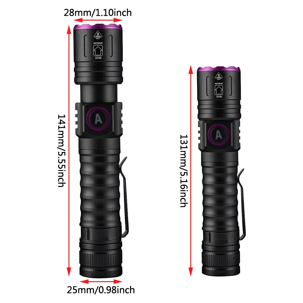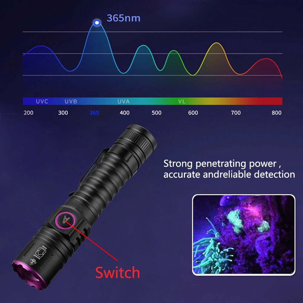 eBay Product Description Description: Light bulb: 1PC 365nm UV LED Modes: High light Material: Aluminum alloy Purple light wavelength: 365nm/395nm Purple light power: 5W Battery: for 1x battery Charging method: Type-c USB charging Dimensions: 131-141mm/5.16-5.55in(length) x 28mm/1.10in(head) x 25mm/0.98in(Tail) Weight: About 101g/0.22Lb Application area: 365nm UV FLASHLIGHT: 365nm ultraviolet light is invisible to the naked eye, so that it is not as BRIGHT as the 395nm flashlight, but more perfect for detection of high demand like fluorescent agents & security code. 365nm UV is the real dedicated detection spectrum. It can be used in natural light and performs better in the dark with little visible light leak. can be used as pet(dog/cat) urine detector/scorpion/finder/fluorescent/detector/currency/license/card/passport authenticating/oil stains/leakage detector/ore ect. Packing List: 1 x UV Flashlight 1 x battery 1 x USB charging cable Payment - We accept Paypal only, you can purchase by Paypal. - Payment must be made within 2 working days of auction closing. (Non-payment may result in a UPI (Unpaid Item) being put on your account. eBay will automatically close your account if you accumulate 4 UPI's total.) - Please list your special requests (color, packages, etc.) in the PAYPAL NOTES SECTION when you make payment. Shipping - We ship worldwide. - Item will be shipped within 1 business days. - We only ship to PayPal confirmed address. For international buyers, we only ship to PayPal verified users. So before bidding, please kindly verify your PayPal account. - We are not responsible for possible duty, tax or any charges in the buyer's country, We do not charge you any sales tax, customs duty is the obligation and liability of a citizen, in your country, so you should be responsible for any taxes incurred. - Delivery time to below: USA ------------------------------------ 8-12 working days Canada/Australia/UK------------------------- 10-16 working days Other countries ------------------------------ 12-30 working days Returns - As a responsible seller, we guarantee free exchange or full refund, if item is defective. - Valid period is 60 days from the day of placing order, so please inform us about defect in advance once you find it. - We can refund or replace it if the item is not as described or damaged in transportation. - Any question you would like to ask ,welcome to email us by the EBAY message. Contact Us - We always receive message and reply by within 24 hours when you sent us message. - Thanks for your purchasing! powered by