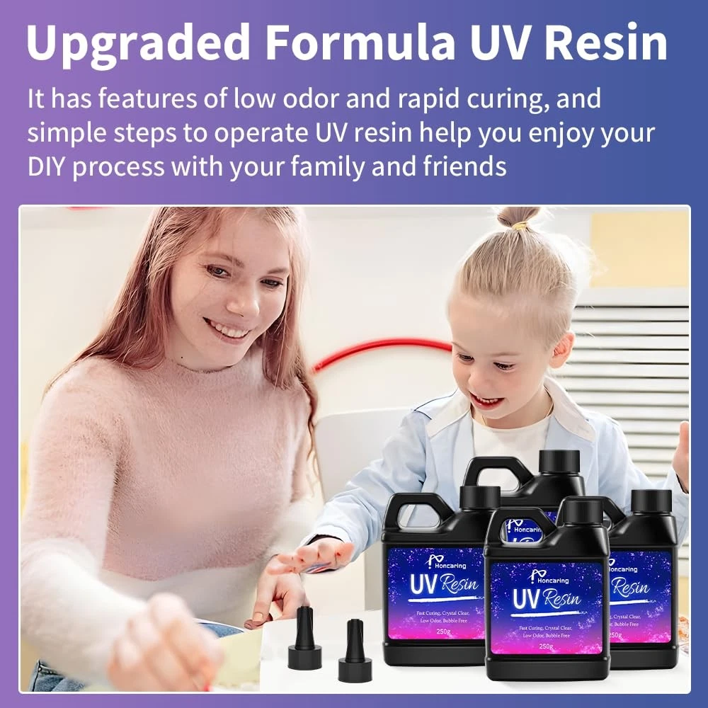 Please note: 1.Don’t use it to make large project. 2.36W light is the best power for curing. Other light, sometimes it is probable sticky, but final cure fully after a long time under strong sunlight. 3.Curing time need to be extended if you mix with pigment dye. 4.Cool down for about 5-7 minutes before demoulding (as curing bring heat). 5.Curing Time: other case, please refer to the above Note-UV/LED Lamp(36W): 1-3 minutes; Direct Sunlights: 10-60 minutes. 6.Package Included : UV resin 250g*4. UV Resin Kit 1000g: UV resin is made of premium materials. Silicone gluing tools can help you better operate the DIY process. Cure UV resin with UV resin light, the light power higher, the curing time shorter Easy to Use: No need to measure and stir like epoxy resin, UV resin is ready to use and can cure fast in minutes with UV light, later you can get beautiful DIY craft productions. Tools included will greatly help your crafts making Wide Applications: This UV resin can be used in many fields for its high hardness and fast curing feature, such as jewelry making, pendants, keychains, DIY craft, etc. Unleash your imagination to make your own resin crafts Less Bubble & Low Odor: Made by upgraded formula, this UV resin is low odor and has less bubble, helping you create more transparent and yellow-resistant UV resin crafts. With crystal clear UV resin, your DIY craft will be more attractive and long-lasting Tips: Make your the working place and tools clean and dry before using; remember to wear gloves and apron when crafting; store this UV resin kit in dry cool place. Please note that the actual curing time is affected by thickness, transparency, etc NOTE: UV resin thickens in winter, and is more likely to trap air and produce bubbles than in other seasons; Therefore, it is recommended that you soak the bottle in hot water for 1-2 minutes before use