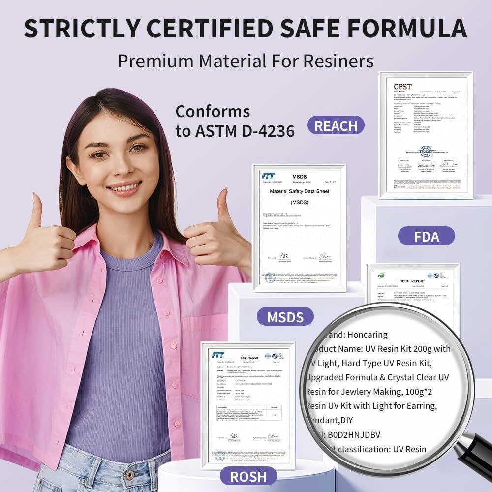 UV Resin Kit 200g with UV Light, Hard Type UV Resin Kit, Upgraded Formula & Crystal Clear UV Resin for Jewlery Making, 100g*2 Resin UV Kit with Light for Earring, Pendant, DIY, Size: 200g with uv light Color clear Theme Unicorn Cartoon Character DIY Crafts Item dimensions L x W x H 5.5 x 2.4 x 6.1 inches Friendly Beginners UV Resin Kit: Honcaring UV Resin 200g Kit contains UV resin 100g*2, 8W UV resin light*1, silicone cup*2, disposable gloves*2, blue silicone mat*1. Want to get start UV resin art, try our Honcaring UV resin kit Easy to Use: No need to measure and stir like epoxy resin, UV resin is ready to use and can cure fast in minutes with UV light, later you can get beautiful DIY craft productions. Tools included will greatly help your crafts making Wide Applications: This UV resin can be used in many fields for its high hardness and fast curing feature, such as jewelry making, pendants, keychains, DIY craft, etc. Unleash your imagination to make your own resin crafts Less Bubble & Low Odor: Made by upgraded formula, this UV resin is low odor and has less bubble, helping you create more transparent and yellow-resistant UV resin crafts. With crystal clear UV resin, your DIY craft will be more attractive and long-lasting Tips: Make your the working place and tools clean and dry before using; remember to wear gloves and apron when crafting; store this UV resin kit in dry cool place. Please note that the actual curing time is affected by thickness, transparency, etc NOTE: UV resin thickens in winter, and is more likely to trap air and produce bubbles than in other seasons; Therefore, it is recommended that you soak the bottle in hot water for 1-2 minutes before use