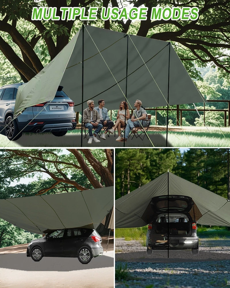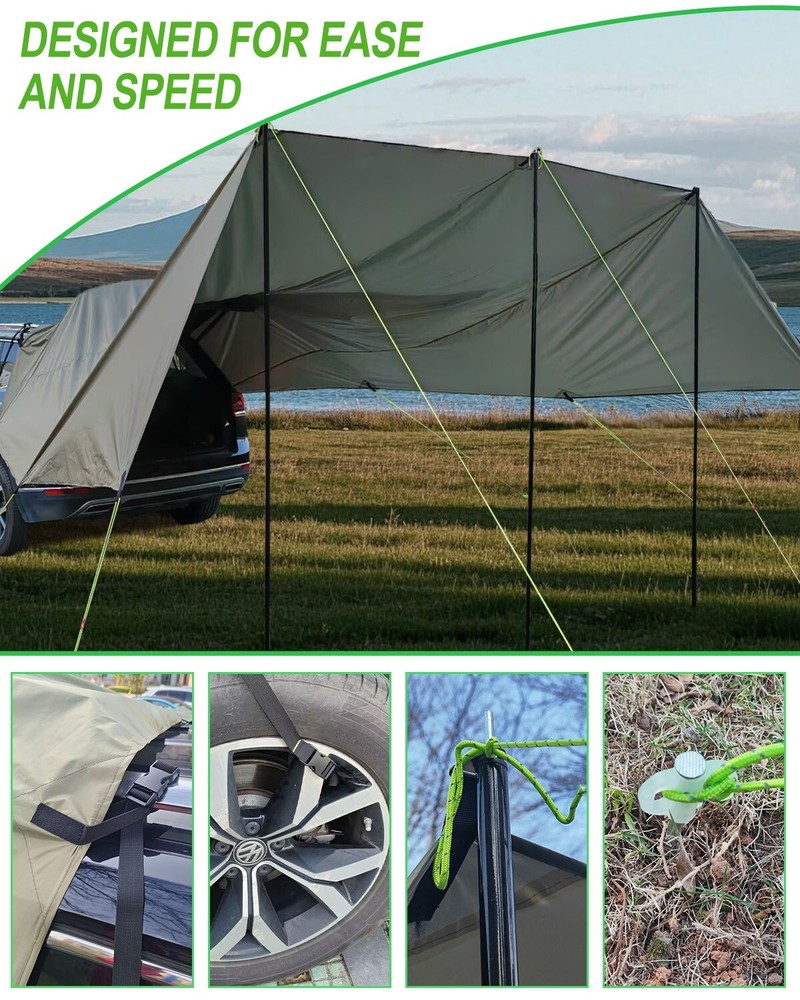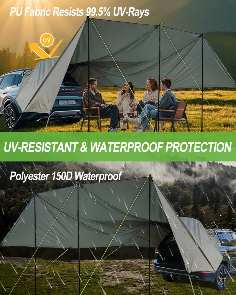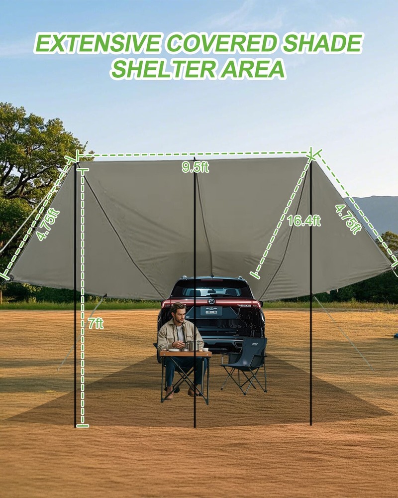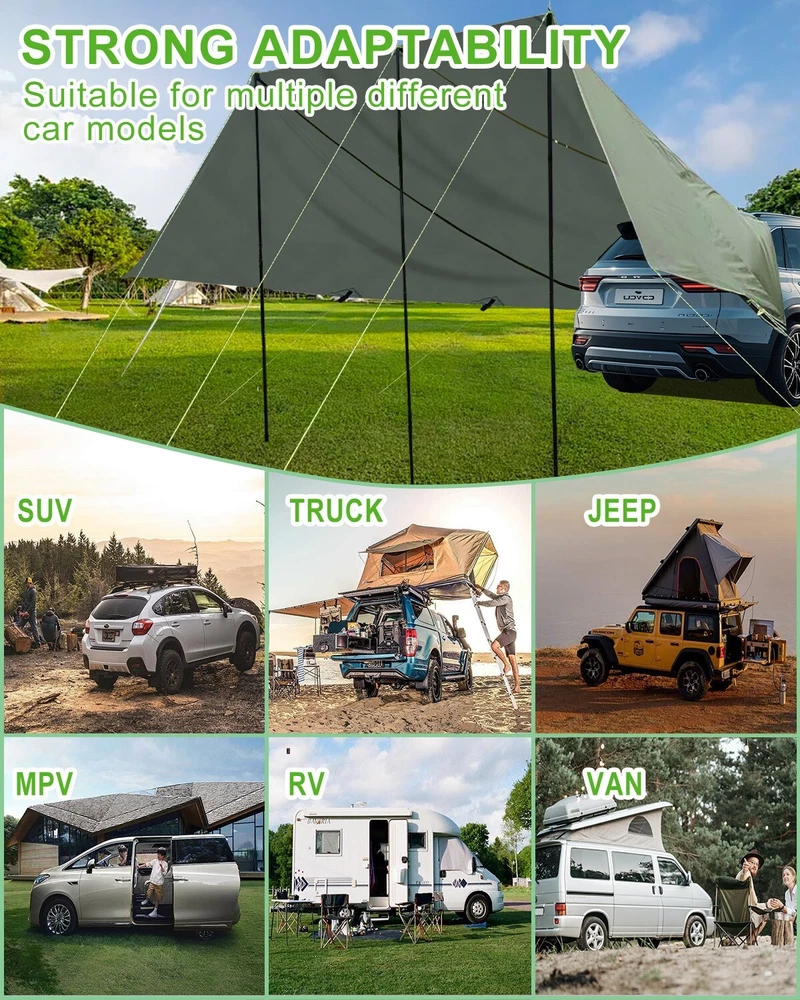 [EXCELLENT FABRIC PROTECTION]: Our car awning for suv paired with silver PU lining. The suv awning is reinforced at the connection corners, which has tear resistance and waterproofness, and can withstand 99.5% ultraviolet rays. Provide you with a comfortable sun shading environment [SPACIOUS SUNSHADE SPACE]: The size of the truck canopy is 196 x 228/103 inches, providing approximately 20 square meters/215 square feet of shading area. It can accommodate 4-5 people sitting around a table, providing a safe and comfortable residence outdoors, making it convenient for you and your family to travel [STABLE WINDPROOF SUPPORT]: Equipped with three support rods, it can ensure that the umbrella cover does not sag in the middle. Featuring greater stability, equipped with 8 ground studs and 8 green fluorescent wind ropes, it provides excellent windproof performance for truck awning [UNIVERSAL AND COMPLETE ACCESSORIES]: The tailgate suv tents for camping can be connected to most MPV, SUV, Trucks, VANs, CUV and other vehicles with universal fit design, equipped with 8 ground studs, 8 green fluorescent wind ropes, 3 support rods, and two storage bags (one canopy and one support rod) [EASY AND FAST INSTALLATION]: Using a detachable buckle connection system, simply connect the middle buckle to the roof rack, connect the two buckle ends to the tires, use support rods to support the canopy, fix the ground nails, and easily complete the installation of the camping awning