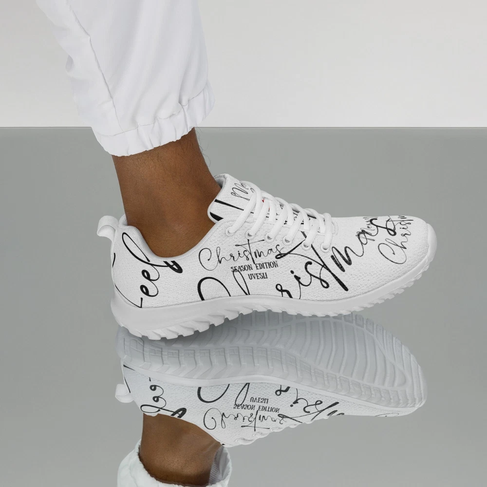 Embrace the festive spirit with UVelsi's Christmas Season Edition Athletic Shoes, a perfect blend of comfort and holiday cheer. These sneakers are designed for both men and women, featuring a sleek white polyester upper that effortlessly complements any seasonal outfit. The mid-top shaft style ensures a secure fit, while the standard shoe width accommodates a variety of foot sizes. Crafted for versatility, these shoes are suitable for a wide range of occasions, from activewear to casual workdays. The durable rubber outsole provides reliable traction for activities such as basketball, running, and gym training, while the padded insole and cotton lining offer all-day comfort. Whether you're hitting the pavement or celebrating the holiday season, these UVelsi sneakers are your go-to choice for style and functionality. Stay active throughout the week with these uniquely-designed athletic shoes. They feature a soft, padded inside for maximum comfort and a rubber outsole for stability. • 100% polyester ultralight flyknit • Ethylene-vinyl acetate (EVA) rubber outsole • Breathable lining • Soft insole and a padded collar • Lace-up front • Soles and laces in matching colors Disclaimers: • The outsole design varies by size. Sizes 37.5 to 40 have a point-like pattern, while sizes 40.5 to 47.5 feature stripes. • A strong glue smell is expected upon the product’s arrival. Allow the shoes to air out for a couple of days and the smell will disappear. Size guide preview (Imperial) US Men UK Europe Japan Foot length Outsole length Insole width 5 5 4 37.5 23 9 ⅛ 10 ½ 3 ⅛ 6 6 5 38.5 24 9 ½ 10 ¾ 3 ¼ 7 7 6 40 25 9 ¾ 11 3 ⅜ 8 8 7 41 26 10 ⅛ 11 ¼ 3 ⅜ 9 9 8 42.5 27 10 ½ 12 3 ⅝ 10 10 9 44 28 10 ¾ 12 ½ 3 ⅝ 11 11 10 45 29 11 ¼ 12 ¾ 3 ¾ 12 12 11 46.5 30 11 ¾ 13 ¼ 3 ⅞ 7.5 7.5 6.5 40.5 25.5 10 11 ¼ 3 ⅜ 8.5 8.5 7.5 42 26.5 10 ¼ 11 ¾ 3 ⅜ 9.5 9.5 8.5 43 27.5 10 ⅝ 12 3 ⅝ Size guide preview (Metric) US Men UK Europe Japan Foot length Outsole length Insole width 5 5 4 37.5 23 23.2 26.7 8 6 6 5 38.5 24 24.1 27.3 8.3 7 7 6 40 25 24.8 28 8.6 8 8 7 41 26 25.7 28.6 8.6 9 9 8 42.5 27 26.7 30.5 9.1 10 10 9 44 28 27.3 31.8 9.1 11 11 10 45 29 28.6 32.4 9.5 12 12 11 46.5 30 29.9 33.7 10 7.5 7.5 6.5 40.5 25.5 25.4 28.6 8.6 8.5 8.5 7.5 42 26.5 26 29.9 8.6 9.5 9.5 8.5 43 27.5 27 30.5 9.1