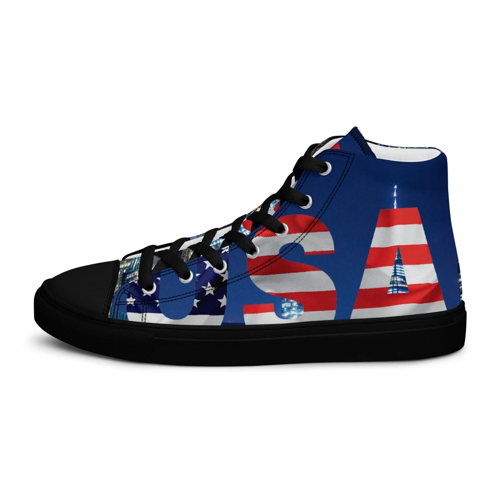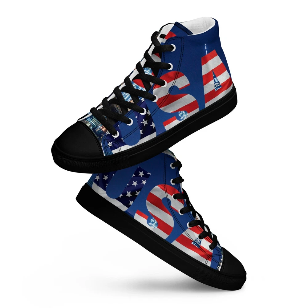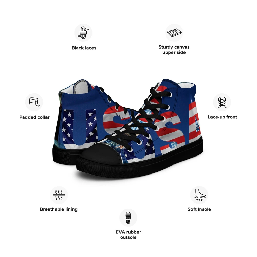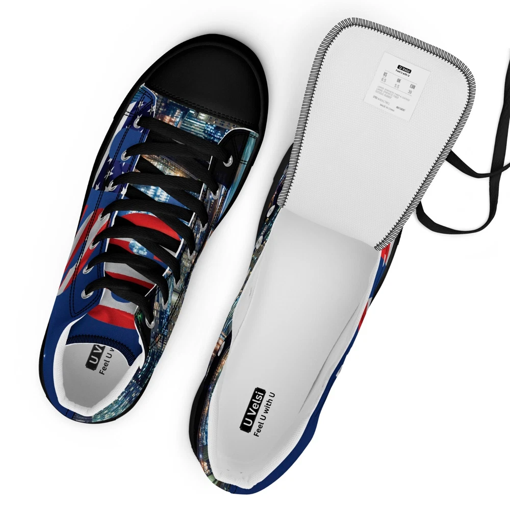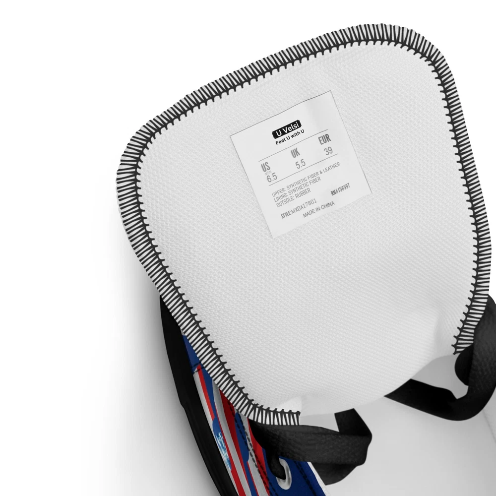 Elevate your footwear game with the UVelsi UiLux USA Edition Sneakers. Crafted with a sleek black canvas upper and a durable rubber outsole, these high-top sneakers offer both style and comfort. Designed for the active man, they feature a padded insole with faux fur lining to keep your feet warm and cozy in any season. With a versatile lace-up closure, these shoes are made for a range of occasions, whether you're hitting the gym or just out for a casual stroll. The UVelsi UiLux sneakers are not just about looks; they're built for performance too, with their adjustable steel toe and versatile cleat type suitable for various athletic activities. These lightweight, limited-edition kicks also boast a solid pattern that pairs effortlessly with any outfit. Handmade with care and attention to detail, these sneakers embody the essence of American craftsmanship, making them a standout addition to any collection. Step up your shoe game with the High Top Canvas Shoes. These handmade, trendy shoes are sure to spice up your outfit. Get yours now! • 100% polyester, canvas upper side • Ethylene-vinyl acetate (EVA) rubber outsole • Breathable lining, soft insole • Faux leather toe cap • Padded collar, lace-up front • Soles and laces in matching colors Size guide preview (Imperial) US Men UK Europe Foot Length Japan Outsole Length 8 8 7 41 10 ⅛ 26 11 ⅛ 9 9 8 42.5 10 ½ 27 11 ⅝ 10 10 9 44 10 ¾ 28 12.00 11 11 10 45 11 ¼ 29 12 ⅛ 12 12 11 46.5 11 ¾ 30 12 ¾ 7.5 7.5 6.5 40.5 10.00 25.5 11 ⅛ 8.5 8.5 7.5 42 10 ¼ 26.5 11 ⅜ 9.5 9.5 8.5 43 10 ⅝ 27.5 11 ⅝ 10.5 10.5 9.5 44.5 11.00 28.5 12 ⅛ 11.5 11.5 10.5 46 11 ½ 29.5 12 ½ Size guide preview (Metric) US Men UK Europe Foot Length Japan Outsole Length 8 8 7 41 25.7 26 28.3 9 9 8 42.5 26.7 27 29.5 10 10 9 44 27.3 28 30.5 11 11 10 45 28.6 29 30.8 12 12 11 46.5 29.9 30 32.4 7.5 7.5 6.5 40.5 25.4 25.5 28.3 8.5 8.5 7.5 42 26 26.5 29 9.5 9.5 8.5 43 27 27.5 29.5 10.5 10.5 9.5 44.5 28 28.5 30.8 11.5 11.5 10.5 46 29.2 29.5 31.8