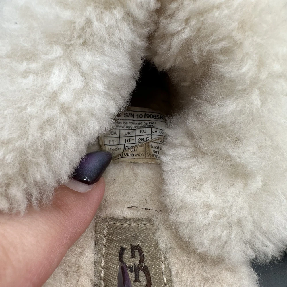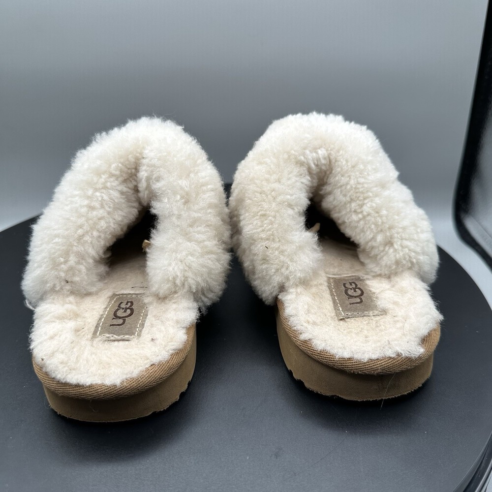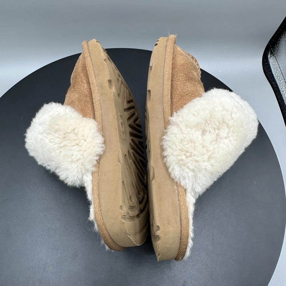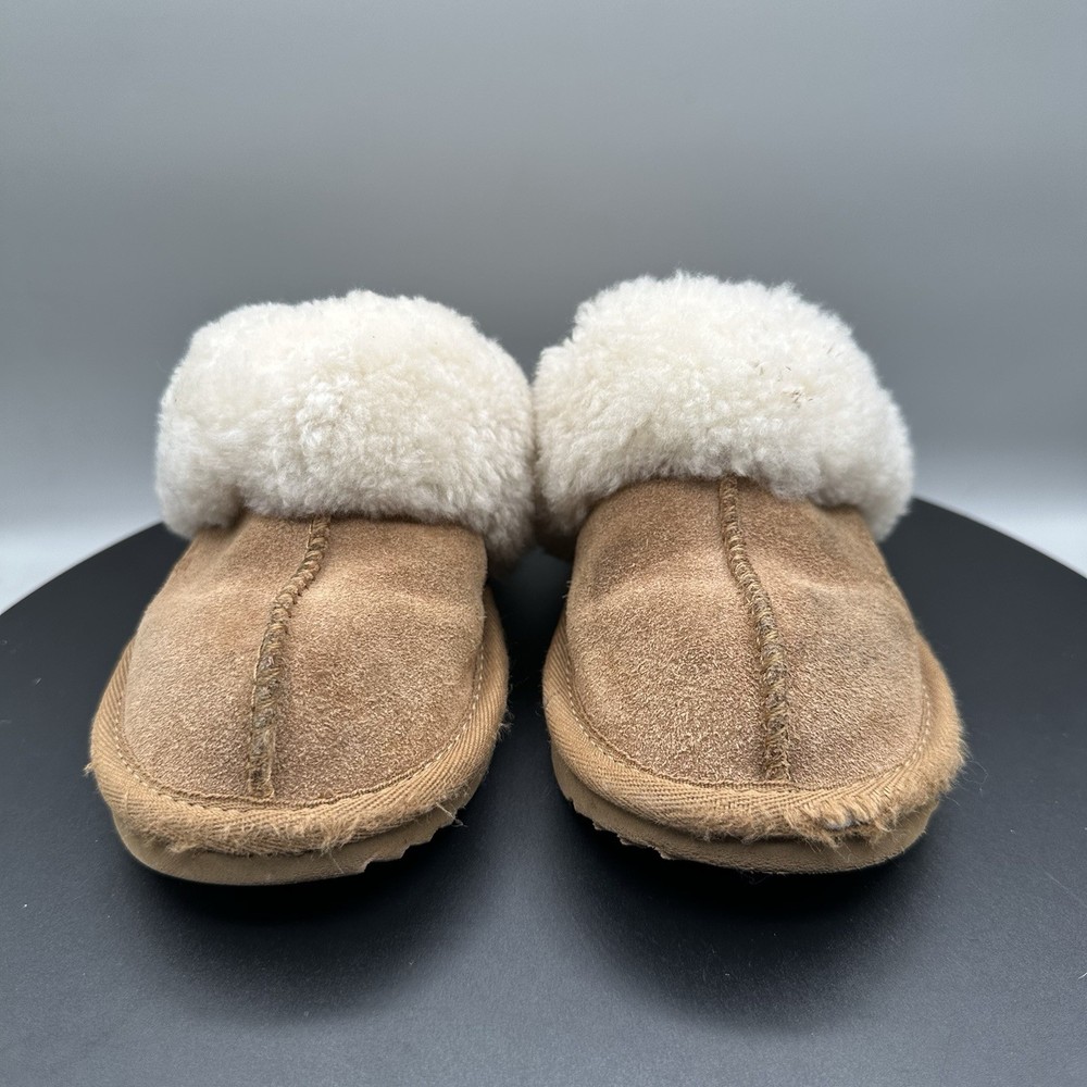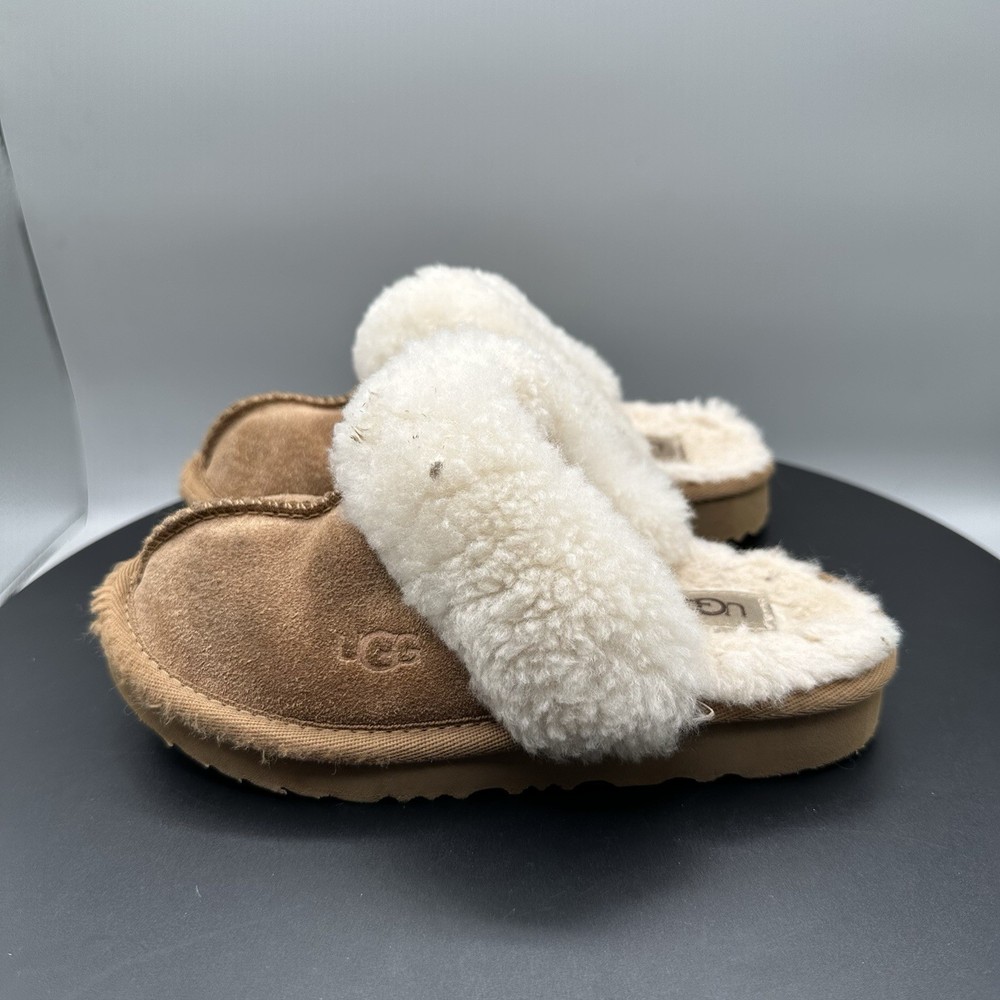 Ugg Cozy II Slipper Youth Size 11 Suede Sheepskin Chestnut Good pre-owned condition, marks on trim of one slipper. The Ugg Cozy II Slipper in youth size 11 is a cozy and stylish slipper perfect for girls. Made with suede and sheepskin lining, these slippers are ideal for casual or travel occasions during the winter, fall, or spring seasons. The slip-on style features a flat heel and fur trim accents, adding a touch of luxury to the design. With the iconic Ugg logo and a comfortable wool insole, these slippers combine both style and functionality for young girls on the go.