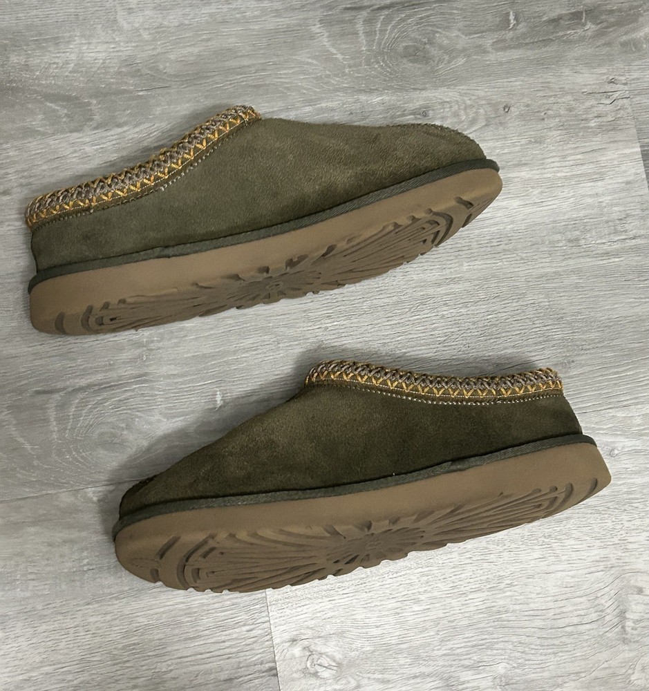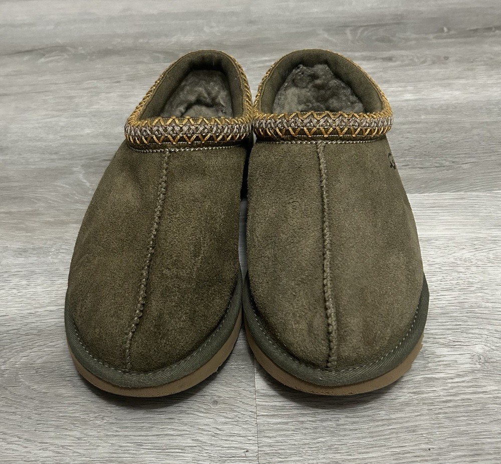 The product is a pair of UGG Tasman slippers in size 8.5 for men. These classic green slip-ons feature a flat heel, wool lining, and suede upper material. With a solid pattern and a standard shoe width, these lined slippers are perfect for lounging around the house in comfort and style. The UGG brand is known for quality and this model is no exception, making it a great choice for any man looking for a cozy and fashionable slipper option.