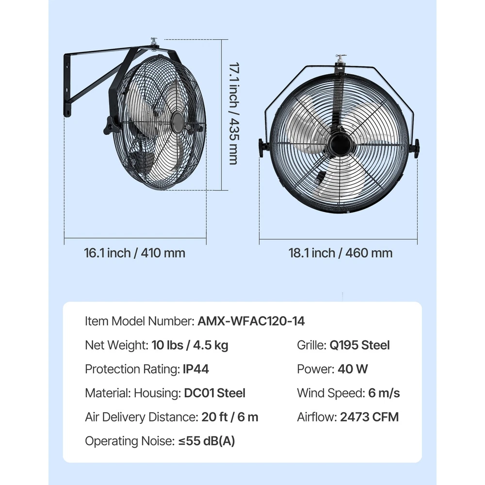 Stay Cool and Comfortable Effortlessly Looking for a solution to keep your garage or workshop cool? This heavy-duty wall-mounted fan provides strong airflow to help you stay comfortable. Its space-saving wall installation is perfect for efficiently cooling and ventilating expansive areas. Fully Adjustable Airflow with 360° Rotation Extended Range Air Transport High-Performance Motor Workspace Storage Facility Workshop Outdoor Space Step 1 Step 2 Step 3 Various Choices to Suit Your Needs Q1: Is this wall-mounted fan waterproof? A1: This model is IP44 rated, meaning it is water splashes-resistant and can be cleaned securily. However, it should not be used in fully open outdoor areas. If installed in a semi-open space, we recommend adding a protective barrier to avoid rainwater from entering and damaging the unit. Q2: Is the fan loud during operation? A2: At its lowest speed setting, the fan produces a noise level of 55 dB(A) when measured at close range. For a quieter experience, we recommend using the fan in open or well-ventilated areas to reduce perceived noise. Q3: What type of wall can the fan be mounted on? A3: The fan must be installed on a solid concrete wall. It is not suitable for mounting on wooden patios or drywall. Features & Details Powerful Air Circulation for Quick Cooling: This wall-mounted industrial fan generates robust airflow to efficiently reduce temperatures, reaching up to 26.3 ft (8 m). Perfect for use in workshops, storage facilities, heated kitchens, and other challenging environments. IP44 Water Resistance: Designed for use in moist environments, this wall-mounted fan is equipped with a fully enclosed motor featuring IP44-rated protection, durable copper windings, dual ball bearings, and a GFCI plug to ensure safe operation in humid or partially outdoor areas. Customizable Airflow Control: This wall-mounted industrial fan offers 270° horizontal and 360° vertical rotation, enabling targeted ventilation for expansive areas. Adjustable 3-Speed Wall Fan: Designed for versatile cooling, this wall-mounted fan features three speed options, delivering airflow up to 2473 CFM to suit various seasonal and environmental requirements. Durable All-Metal Design: Built for lasting performance, this wall-mounted fan is equipped with aluminum blades, a steel grille with a protective powder coating, a sturdy metal bracket, and a convenient pull-cord for effortless operation. SHIPPING ABOUT US PAYMENT RETURNS CONTACT WARRANTY Welcome to our eBay store. As a leading and emerging company in manufacturer and exporting business, we are specialized in Business and Industrial Products, Sporting Goods, Pet Products, Home and Garden products for more than 10 years. We believe that it is our vision and mission to provide innovative products with best service and competitive price to satisfy you. Our goal is to make sure that you can find exactly what you are looking for and make it easy for you to place your orders. We accept PayPal payment,PayPal Credit,Credit card or debit card and so on. Payment should be completed within 4 (Four) days of auction closing. Or unpaid dispute will be filed for closing auction. We will leave a positive feedback immediately after payment is received. We appreciate a positive feedback as much as you do. If for some reason there is any issue with the purchase, please contact us prior to leaving feedback, we will be glad to work together and provide a satisfying solution. Please be aware that PO Box cannot receive items, please DO NOT fill in the PO Box address. DELIVERY DAYS: 3-7 BUSINESS DAYS 3 BUSINESS DAYS SHIPPING OUT SHIP FROM CA & TX & NJ & GA & NC &OR WAREHOUSE California Warehouse: City of Industry, CA Texas Warehouse : Houston, TX New Jersey Warehouse : Perth Amboy, NJ New York State Warehouse: Perth Amboy, NJ Georgia Warehouse: Austell,GA North Carolina Warehouse: Grove NC Oregon Warehouse: AIRPORT WAY Portland,OR All of our items are backed with a 30-day return policy. We ensure all our items are new and in excellent condition prior to shipping. In case you receive the item that is not to the standards above, please contact us via e-Bay messages. All returns must be in new original condition as received and should be shipped with delivery confirmation Please note that all returns must be pre-approved by us. Unauthorized returns will not be accepted. If you need to return, please check twice to confirm the item not work and contact our customer service representative, let us know the detailed problem and send us some pictures for confirmation. We ONLY accept returns with original package. Please make sure that item has NO man-made sabotage. Used items will not be accepted for return. Email Customer Support: 9:00am-2:00am PST Sunday-Friday All emails will be responded to within 12-24 hours This item comes with 12 months Warranty from the date of customers purchased it. Special circumstances will be listed clearly in the listing. If your item has been damaged in transit or become faulty in warranty period, please email us with pictures or video to show the problem. Please do check everything carefully after you received the parcel, any the damage except DOA (Dead-On-Arrival) would not be covered if it's your fault. Replacement products are provided with the same warranty as the returned products. Stay Cool and Comfortable Effortlessly Looking for a solution to keep your garage or workshop cool? This heavy-duty wall-mounted fan provides strong airflow to help you stay comfortable. Its space-saving wall installation is perfect for efficiently cooling and ventilating expansive areas. Fully Adjustable Airflow with 360° Rotation Extended Range Air Transport High-Performance Motor Workspace Storage Facility Workshop Outdoor Space Step 1 Step 2 Step 3 Various Choices to Suit Your Needs Q1: Is this wall-mounted fan waterproof? A1: This model is IP44 rated, meaning it is water splashes-resistant and can be cleaned securily. However, it should not be used in 