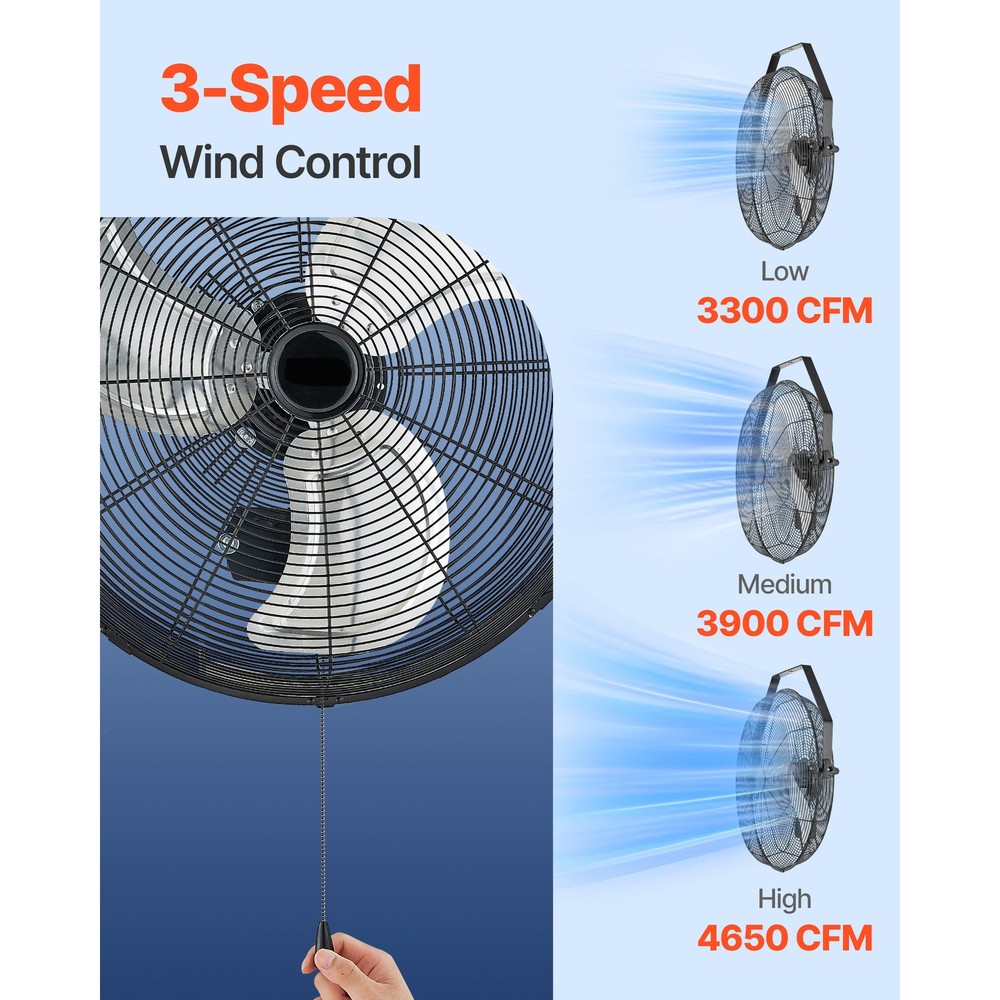 Stay Cool and Comfortable Feeling overwhelmed by heat in your garage or workspace? This heavy-duty wall-mounted fan provides strong airflow to help you cool down quickly. Its space-saving wall installation is ideal for efficiently ventilating and cooling expansive areas. Fully Rotatable Airflow Control Extended Range Air Transport High-Performance Motor Workspace Storage Facility Storage Solutions for Your Garage Outdoor Space Step 1 Step 2 Step 3 Various Choices to Suit Your Needs Q1: Is this wall-mounted fan waterproof? A1: These models are not waterproof. We do not recommend using them in fully open outdoor areas. If used in a semi-open area, please install a barrier or shield to protect against water ingress that may cause damage. Q2: Is the fan loud during operation? A2: At its lowest speed setting, the fan produces a noise level of 55 dB(A) when measured at close range. For a quieter experience, we recommend using the fan in open or well-ventilated areas to reduce perceived noise. Q3: What type of wall can the fan be mounted on? A3: The fan must be installed on a solid concrete wall. It is not suitable for mounting on wooden patios or drywall. Features & Details Powerful Air Circulation for Quick Cooling: This heavy-duty wall-mounted fan generates robust airflow to efficiently reduce heat, with a reach of up to 32 ft / 10 m. Perfect for use in workshops, storage areas, heated kitchens, and other challenging environments. Versatile Application: This wall-mounted fan is designed with a compact hanging structure, making it ideal for installation in patios, garages, workshops, warehouses, and other spaces, providing adaptable cooling solutions for different environments. Fully Adjustable Airflow: This industrial wall-mounted fan offers complete 360° horizontal and vertical adjustment, ensuring targeted air circulation throughout expansive areas. Adjustable 3-Speed Wall Fan: Designed for flexible cooling, this wall-mounted fan features three speed options, delivering airflow up to 4650 CFM to suit varying seasonal and environmental requirements. Durable All-Metal Design: Built for lasting performance, this wall-mounted fan is equipped with aluminum blades, a steel grille with a powder-coated finish, a robust metal bracket, and a convenient pull-cord mechanism for effortless operation. SHIPPING ABOUT US PAYMENT RETURNS CONTACT WARRANTY Welcome to our eBay store. As a leading and emerging company in manufacturer and exporting business, we are specialized in Business and Industrial Products, Sporting Goods, Pet Products, Home and Garden products for more than 10 years. We believe that it is our vision and mission to provide innovative products with best service and competitive price to satisfy you. Our goal is to make sure that you can find exactly what you are looking for and make it easy for you to place your orders. We accept PayPal payment,PayPal Credit,Credit card or debit card and so on. Payment should be completed within 4 (Four) days of auction closing. Or unpaid dispute will be filed for closing auction. We will leave a positive feedback immediately after payment is received. We appreciate a positive feedback as much as you do. If for some reason there is any issue with the purchase, please contact us prior to leaving feedback, we will be glad to work together and provide a satisfying solution. Please be aware that PO Box cannot receive items, please DO NOT fill in the PO Box address. DELIVERY DAYS: 3-7 BUSINESS DAYS 3 BUSINESS DAYS SHIPPING OUT SHIP FROM CA & TX & NJ & GA & NC &OR WAREHOUSE California Warehouse: City of Industry, CA Texas Warehouse : Houston, TX New Jersey Warehouse : Perth Amboy, NJ New York State Warehouse: Perth Amboy, NJ Georgia Warehouse: Austell,GA North Carolina Warehouse: Grove NC Oregon Warehouse: AIRPORT WAY Portland,OR All of our items are backed with a 30-day return policy. We ensure all our items are new and in excellent condition prior to shipping. In case you receive the item that is not to the standards above, please contact us via e-Bay messages. All returns must be in new original condition as received and should be shipped with delivery confirmation Please note that all returns must be pre-approved by us. Unauthorized returns will not be accepted. If you need to return, please check twice to confirm the item not work and contact our customer service representative, let us know the detailed problem and send us some pictures for confirmation. We ONLY accept returns with original package. Please make sure that item has NO man-made sabotage. Used items will not be accepted for return. Email Customer Support: 9:00am-2:00am PST Sunday-Friday All emails will be responded to within 12-24 hours This item comes with 12 months Warranty from the date of customers purchased it. Special circumstances will be listed clearly in the listing. If your item has been damaged in transit or become faulty in warranty period, please email us with pictures or video to show the problem. Please do check everything carefully after you received the parcel, any the damage except DOA (Dead-On-Arrival) would not be covered if it's your fault. Replacement products are provided with the same warranty as the returned products. Stay Cool and Comfortable Feeling overwhelmed by heat in your garage or workspace? This heavy-duty wall-mounted fan provides strong airflow to help you cool down quickly. Its space-saving wall installation is ideal for efficiently ventilating and cooling expansive areas. Fully Rotatable Airflow Control Extended Range Air Transport High-Performance Motor Workspace Storage Facility Storage Solutions for Your Garage Outdoor Space Step 1 Step 2 Step 3 Various Choices to Suit Your Needs Q1: Is this wall-mounted fan waterproof? A1: These models are not waterproof. We do not recommend using them in fully open outdoor areas. If used in a semi-open area, please install a barrier or shield to protect against water ingress that may cause damage. Q2: Is the fan loud d