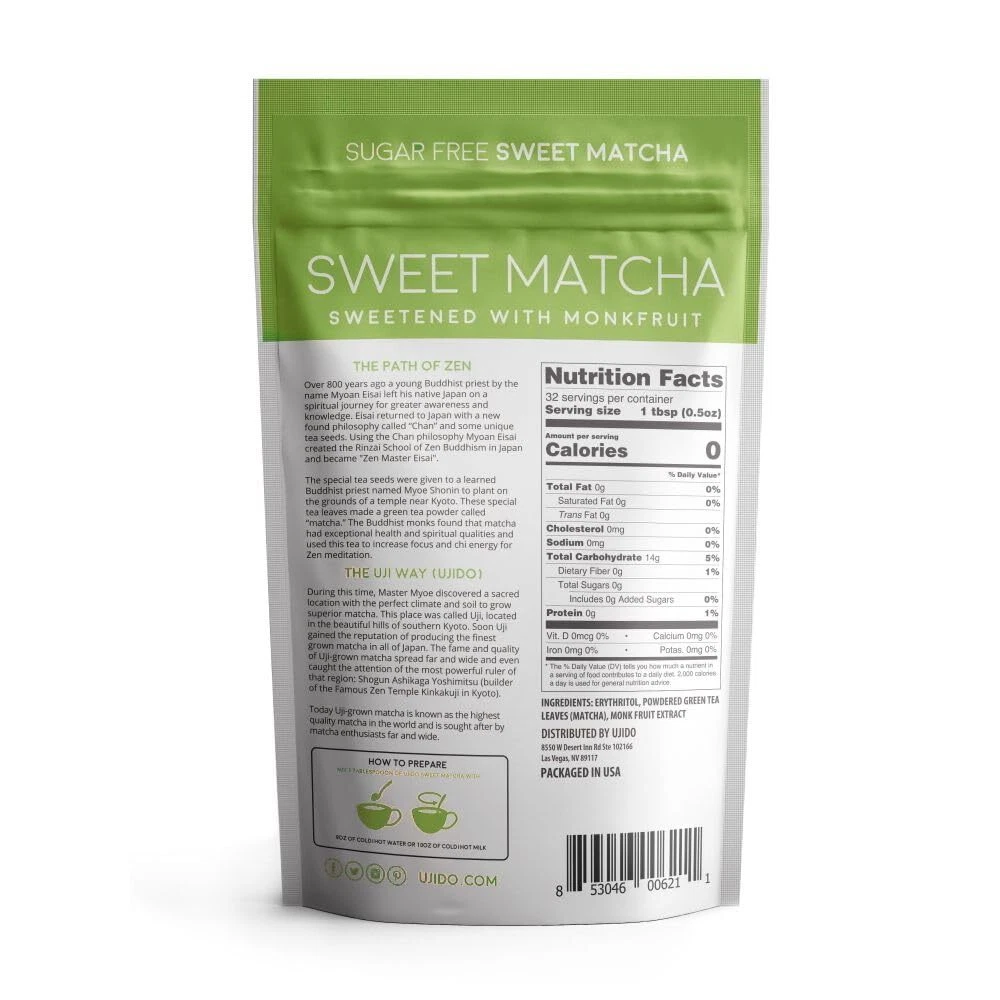 Ujido's Matcha green tea is carefully sourced from the highest quality tea leaves cultivated and hand-picked at the farm in Uji, Kyoto Japan. Traditional Japanese Matcha from 183 year old Uji City Manufacturer producing matcha by enviromental, traditional way. *** NOT MADE IN CHINA, NO HEAVY METALS*** Authentic covered tea garden for highest nutrition. Choice of the imperial families and Zen Buddhist monks. High quality control and low bacteria count. Tea Leaves are 100% genuinely hand picked. Stoneground and deep green color. High in chlorophyll. High in L-Theanine. Reduces physiological and psychological . Relaxes and refreshes the body. Improves focus and clearer thinking. Boosts metabolism and assists in weight loss. Great source of EGCG Polyphenols. Enhance Your Wellness: For over a millennium Matcha green tea has been used by many cultures for it's numerous benefits. Zen Buddhist monks use it as a means to relax and meditate while remaining alert, resulting from the unique amino acids in the tea leaves. Matcha can help to nourish, stimulate and protect your brain - enhancing your overall mood and leading to improved concentration. Increase your energy levels and endurance! Samurai warriors of early Japan drank Matcha Green Tea before going into battle due to the tea's energizing properties. While all green tea naturally contains caffeine, the energy boost received from Matcha is largely due to its unique combination of other nutrients. These properties can help stimulate your metabolism and aid in fat loss! Ujido's Matcha green tea provides powerful age-fighting antioxidants to protect your skin, and reduce inflammation in your body. Our Matcha tea leaves are of the highest quality for superior taste and benefits. VIBRANT & TENDER. Ujido’s Sweet Matcha is the ideal blend of 1st harvest ceremonial and 2nd harvest high culinary Matcha, so you get the flavor of ceremonial at the price of a quality culinary . This Matcha is shade grown and handpicked in early spring for vibrant and tender tea leaves before it is stone-ground. ANTIOXIDANT SUPERFOOD. This green tea has the natural superfood nutrition of L-Theanine, catechins, EGCG, and chlorophyll. Gluten free and keto friendly, this Matcha latte blend is sweetened with monk fruit and non-GMO erythritol for a naturally sweet, zero-calorie drink that has the rich Matcha tea flavor without the calories. DELICIOUS & SMOOTH. Sweet Matcha has a smooth, mellow, soothing flavor only found in superior quality Matcha. Mix with hot milk or milk substitutes for a sweet Matcha latte. It can also be mixed with water for a delicious Matcha tea, with ice water for a sweet iced tea, or in Matcha smoothies and low-sugar treats. JAPANESE HERITAGE. Ujido Matcha is grown in Uji, Japan, the birthplace of Matcha where Matcha has been produced for over 800 years. This is the same highly sought-after tea used in traditional Japanese tea ceremonies. SUPERIOR QUALITY. Ujido is a Japanese company providing real Matcha, not sencha or regular green tea from China like many others on the market. Our Matcha is grown in the foothills of Uji, where Matcha was born and is free from metals and radiation. We never use lower grades of Matcha from lesser regions. We live and breathe the Matcha lifestyle, from farm to latte.