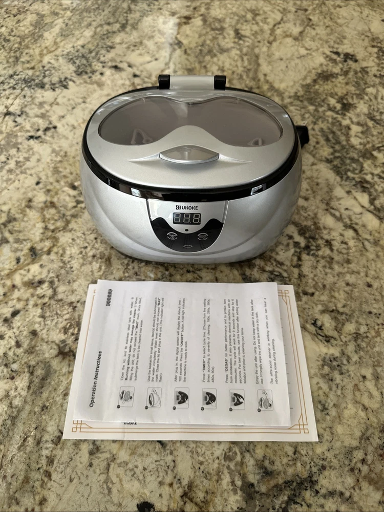 UKOKE 3800S Professional Ultrasonic Jewelry Cleaner Machine, 0.6L Portable Household Timer Device for Eyeglasses, Dentures, Watches, Rings | Silver, Fast Deep Cleaning for Small Accessories Product Details Color: Silver Design: Ultrasonic Cleaner Brand: Ukoke MPN: 3800S UPC: 856121007080 EAN: 0856121007080 Color: Silver Brand: Ukoke Material: Stainless Steel, Plastic Product Dimensions: 6.73"D x 9.51"W x 4.72"H Item Weight: 2 Pounds MULTI-PURPOSE ULTRASONIC CLEANER Perfect for cleaning jewelry, eyeglasses, dentures, watches, coins, lab instruments, and more. Ideal for optical shops, jewelry stores, repair centers, dental clinics, laboratories, and home use. Cleans in minutes using only tap water! POWERFUL & SAFE CLEANING Generates 42,000 Hz of ultrasonic sound waves for a deep yet gentle clean, removing dirt and grime without damaging valuables. Refreshes items to look brand new!POWERFUL & SAFE CLEANING Generates 42,000 Hz of ultrasonic sound waves for a deep yet gentle clean, removing dirt and grime without damaging valuables. Refreshes items to look brand new! ADVANCED DEGASSING FUNCTION The exclusive Degas Mode removes trapped air bubbles from water, improving ultrasonic cleaning efficiency while preventing oxidation and chemical reactions that traditional cleaners cant avoid. TEASY TO USE WITH TOUCH CONTROLS Features a modern digital touch control panel for precise cleaning. Choose from 5 preset cycles (90, 180, 280, 380, & 480 seconds) based on your cleaning needs. Stable & durable compared to traditional push buttons. LARGE 600ML (20 OZ) CAPACITY The stainless steel tank (5.4 L x 3.6 W x 2.1 H) accommodates a variety of items, ensuring a professional-grade clean at home. RECOMMENDED CLEANING TIP Add a few drops of liquid dish soap for even better results! Safe for metals, glass, ceramics, and more. Not suitable for pearls, coral, emeralds, jade, or microfiber items. 1-YEAR REPLACEMENT WARRANTY Buy with confidence! Backed by a 1-year free replacement policy for any quality issues. 24/7 CUSTOMER SUPPORT Have questions? Our dedicated customer service team is ready to assist within 24 hours!