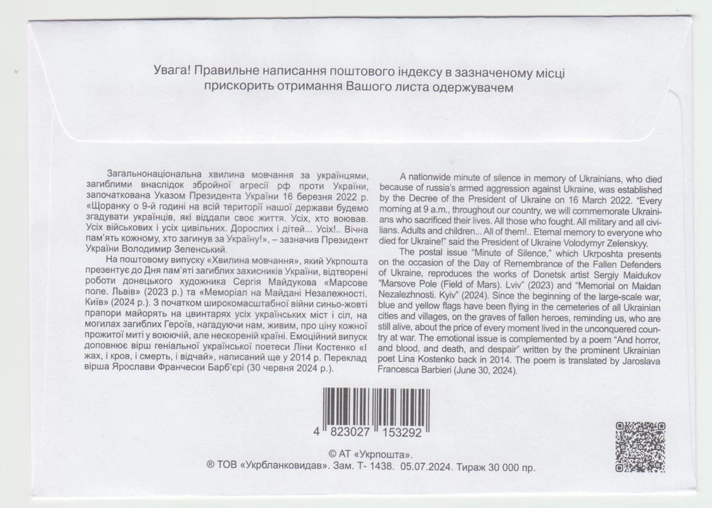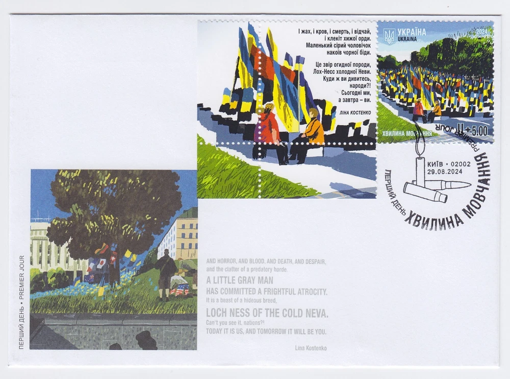 Ukraine 2024 - FDC «Minute of silence» - KYIV 02002 Cancellation - with coupon Description: A nationwide minute of silence in memory of Ukrainians, who died because of russia's armed aggression against Ukraine, was established by the Decree of the President of Ukraine on 16 March 2022. "Every morning at 9 a.m., throughout our country, we will commemorate Ukrainians who sacrificed their lives. All those who fought. All military and all civilians. Adults and children... All of them!.. Eternal memory to everyone who died for Ukraine!" said the President of Ukraine Volodymyr Zelenskyy. The postal issue "Minute of Silence," which Ukrposhta presents on the occasion of the Day of Remembrance of the Fallen Defenders of Ukraine, reproduces the works of Donetsk artist Sergiy Maidukov "Marsove Pole (Field of Mars). Lviv" (2023) and "Memorial on Maidan Nezalezhnosti. Kyiv" (2024). Since the beginning of the large-scale war, blue and yellow flags have been flying in the cemeteries of all Ukrainian cities and villages, on the graves of fallen heroes, reminding us, who are still alive, about the price of every moment lived in the unconquered country at war. The emotional issue is complemented by a poem "And horror, and blood, and death, and despair" written by the prominent Ukrainian poet Lina Kostenko back in 2014. The poem is translated by Jaroslava Francesca Barbieri (June 30, 2024). Each stamp in the sheet contains 5 UAH of charity. Ukrposhta will use the funds raised in this way to support the humanitarian project On the Shield to return fallen soldiers. By buying items from Ukrainian sellers, you are helping Ukrainians resist Russian aggression. Thank you very much for your support!