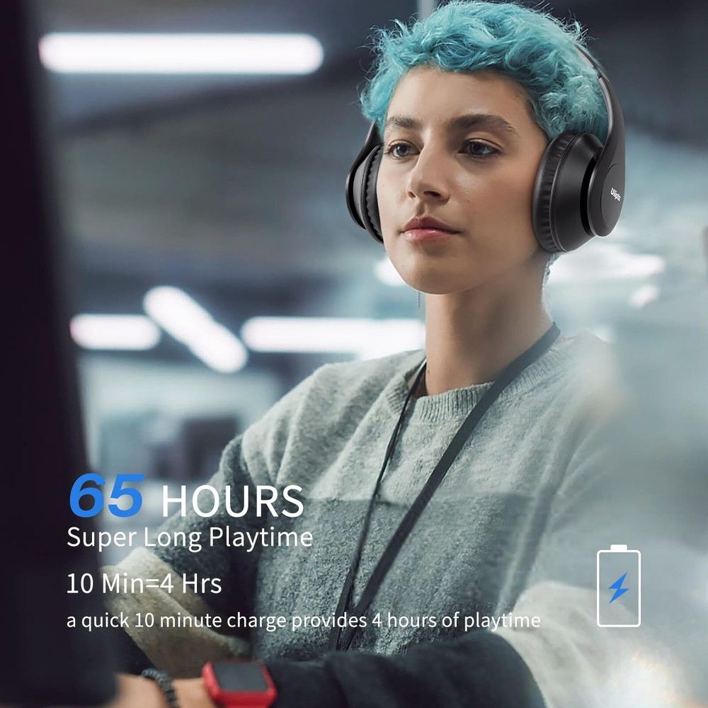 HIGH FIDELITY AUDIO - Bluetooth headphones deliver crystal crisp highs, balanced mids and powerful bass through 40mm acoustic stereo drivers. Equipped with 6 EQ modes, switch according to different music the balanced sound. You can enjoy high-quality crystal clear stereo sound with our over-ear headphones. STRONG BLUETOOTH 5.3 TECH - The wireless Bluetooth headphones are compatible with all Bluetooth-enabled devices. Advanced Bluetooth 5.2 technology provides a more stable, faster Bluetooth connection and can be paired with two devices at once and seamlessly switch between them - meaning you can quickly switch from listening to a playlist on your phone to taking a conference call on your laptop. UP TO 65 HOURS PLAYTIME - wireless headphones deliver up to 65 hours playtime on a single charge. A quick 10-minute charge gives you up to 4 hours of playtime. This wireless headset can also easily connect to other non-Bluetooth devices via a 3.5 mm audio cable, plug in the included audio cable to listen for even longer in wired mode. LIGHTWEIGHT COMFORT - The ear cups are made of acoustically engineered memory foam that provides pillow-like softness while listening. Adjustable metal slider headband and rotatable earmuffs can easily fit any head shape. No matter whether you are doing online class, travel or workout, you’ll almost forget you’re wearing them-- even after hours of listening. CLEAR CONVERSATIONS - Bluetooth headset with built-in microphone has clear voice effect, compatible with smartphones for hands-free calling and use with voice assistants. [Note: Microphone works in wireless/Bluetooth mode only]-- 30 days free return and 12 months warranty is our guarantee, please feel free to contact us if you have any inquiries during use.