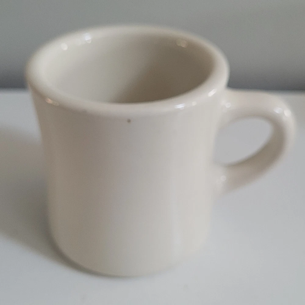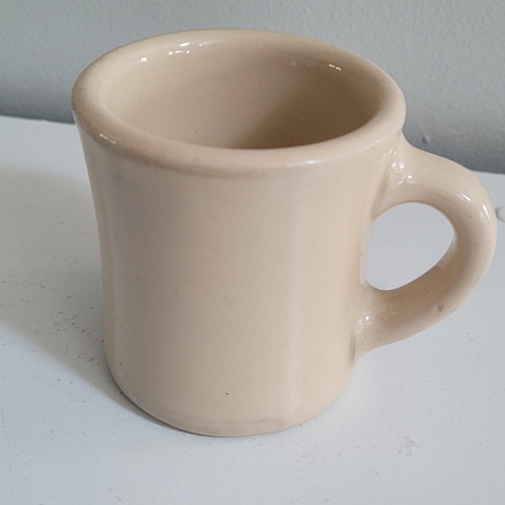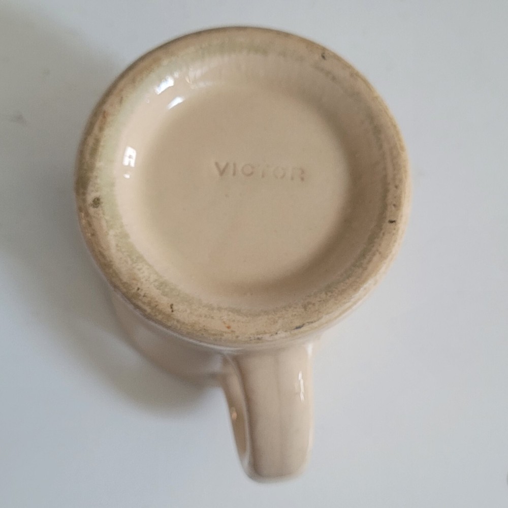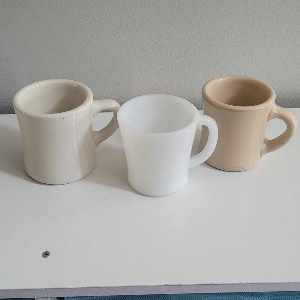 3 Ultima China Victor Restaurant Ware Mugs Coffee Cup Milk Glass Heavy * Ultima China mug approx 3.5" tall * Victor Beige Mug approx 3.25" * Milk Glass mug approx 3.25" unmarked except for 5 Nice set of restaurant ware mugs!