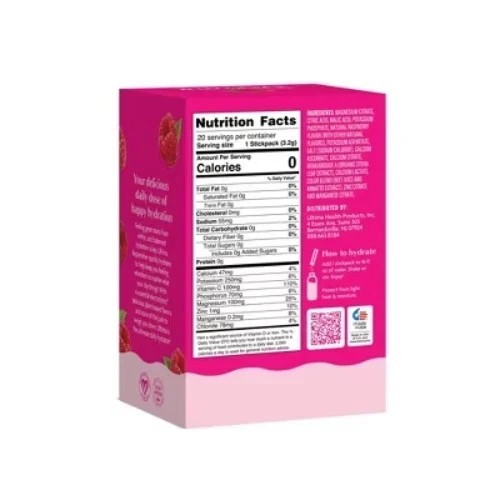 Ultima Replenisher Electrolyte Vegan Drink Mix in Raspberry flavor (2.3oz/20ct) is a sugar-free, vegan, and gluten-free electrolyte powder mix. It contains 6 key electrolytes and trace minerals, and is flavored with real fruit and sweetened with organic stevia according to the product description on eBay. Each 2.3oz pack contains 20 individual stickpacks, and each stickpack is designed to be mixed with 16 ounces of water.
