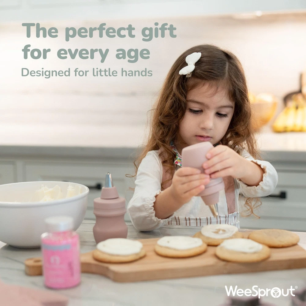 COMPLETE KIDS BAKING SET: This kids baking kit includes: an apron, 2 oven mitts, 2 silicone baking mats, 12 silicone cupcake liners, an icing spreader, 2 silicone icing containers with 6 icing tips, plastic measuring cups and spoons, a stainless steel bowl with lid, 3 stainless steel cookie cutters, a wooden stirring spoon, a wooden rolling pin, and instructional cards. With this baking and cooking set for kids, your little chef has everything needed for kids cooking and baking adventures! DESIGNED FOR SMALL HANDS: The plastic measuring cups and spoons fit comfortably in little palms, while the wooden rolling pin and spoon are sized just right for kids cooking and baking. The stainless steel bowl is perfect for mixing, and its lid keeps ingredients fresh. Tiny bakers will love using the cookie cutters to create fun shapes. With silicone baking mats, cupcake liners, and icing tools, this baking kit gives your child all the kids cooking utensils they need to feel like a pro. SAFE FUN: Every item in this baking kit is created with your child's well-being in mind. The plastic components are free from harmful chemicals, for peace of mind during kids cooking sessions. We've included two oven mitts to protect little hands from heat. The silicone cupcake liners and baking mats are non-stick and easy to clean. With our kids cooking sets, you can relax knowing that your child's culinary adventures are as safe as they are enjoyable. LEARN THROUGH BAKING: The included recipe and instruction cards are designed to be developmentally appropriate, guiding children & parents through each step of the baking process. As they measure, mix, and decorate, kids naturally absorb concepts of math, science, and following instructions. This baking and cooking set for kids fosters independence and problem-solving skills. Watch as your child's confidence grows with each successful baking project wtih our kids cooking and baking set. GIFT OF CREATIVITY: Our kids baking sets for girls and boys make an amazing gift! This comprehensive baking kit sparks creativity and provides hours of fun. Whether it's for a birthday, holiday, or just because, young bakers will be thrilled to receive their very own kids cooking utensils. Give the gift of culinary exploration and watch as the recipient's eyes light up with excitement for their kids cooking adventures!