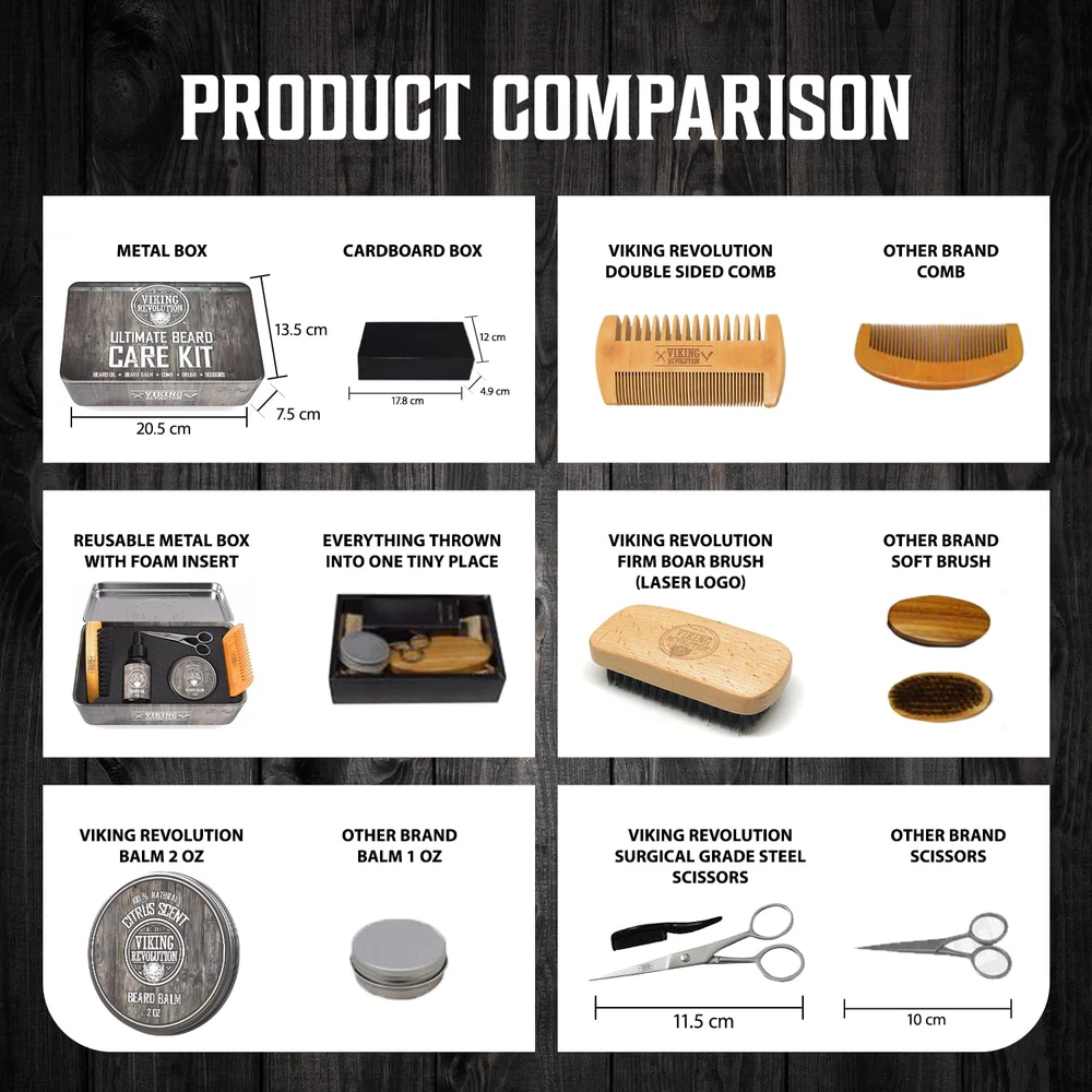 Perfect Holiday Gift For Men - Viking Revolution Beard Kit for men is what your man needs to look smoking hot this holiday! This ultimate beard care kit contains Wooden Boars Hair Beard Brush, Double Sided Pocket Beard Comb, Unscented Beard Care Oil, Citrus Scent Beard Styling Balm, and Beard Scissors in a sleek & stylish metal tin. Complete Grooming: Use the brush and comb for detangling your beard before giving it a trim with the scissors. Then moisturize and soften the hair with beard oil, before styling with the beard balm. Great Value Set: We’ve combined the best mustache and beard care products we can offer in this ultimate grooming set at a fantastic price. Get an amazing deal on brilliant beard care products. Perfect Gift: Ideal for anyone with a beard or mustache, or thinking about growing one, all the beard care products they need come in this portable, travel friendly metal gift box. The Viking Promise: If for any reason, you’re not completely satisfied, simply contact us and we’ll take care of it. Product description 1 BEARD CARE 2 HAIR CARE 3 FACE & BODY 4 SHAVING 5 GIFTS & SETS Find More Legendary Viking Products Add to Cart Add to Cart Add to Cart Add to Cart Add to Cart Add to Cart Add to Cart Customer Reviews 4.7 out of 5 stars 8,950 4.6 out of 5 stars 30,331 4.7 out of 5 stars 10,156 4.6 out of 5 stars 20,210 4.6 out of 5 stars 20,210 4.6 out of 5 stars 4,376 4.7 out of 5 stars 10,156 Price $29.88 $ 29 . 88 $9.99 $ 9 . 99 $29.99 $ 29 . 99 $29.88 $ 29 . 88 $29.88 $ 29 . 88 $49.99 $ 49 . 99 $29.88 $ 29 . 88 Use Beard Care Beard Care Beard Care — Beard Growth Shaving Beard Care Boar Bristle Brush ✔ ✔ ✘ ✔ ✘ ✘ ✔ Pear Wood Comb ✔ ✔ ✔ ✔ ✔ ✘ ✔ Beard Oil ✔ ✘ ✔ ✔ ✔ ✘ ✔ Brand Viking Revolution Viking Revolution Viking Revolution Viking Revolution Viking Revolution Viking Revolution Viking Revolution