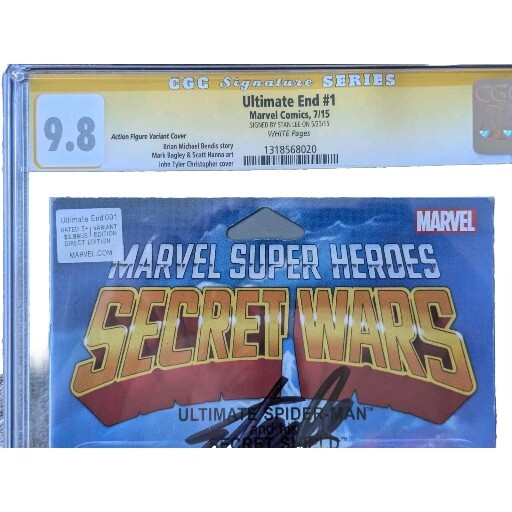 Unit of Sale: Single Unit Type: Comic Book Tradition: US Comics Personalized: No Signed: Yes Genre: Superheroes Superhero Team: Avengers, Fantastic Four Inscribed: Yes Autograph Authentication Number: 1318568030 Signed By: Stan Lee Story Title: Secret Wars (2015) Publication Year: 2015 Era: Modern Age (1992-Now) Series Title: Marvel Super-Heroes Secret Wars Certification Number: 1318568020 Autograph Authentication: Certified Guaranty Company (CGC) Grade: 9.8 Near Mint/Mint Format: Single Issue Character: Doctor Doom (Victor Von Doom), Galactus, Mister Fantastic, Spider-Man (Miles Morales), Spider-Man (Peter Parker) Country of Origin: United States Variant Type: Action Figure Variant Intended Audience: General Audience Style: Color Issue Number: 1 Vintage: No Universe: Marvel (MCU) Ex Libris: No Language: English Publisher: MARVEL Features: Variant Cover Professional Grader: Certified Guaranty Company (CGC) Artist/Writer: Brian Michael Bendis, Stan Lee, Mark Bagley, Scott Hanna, mark