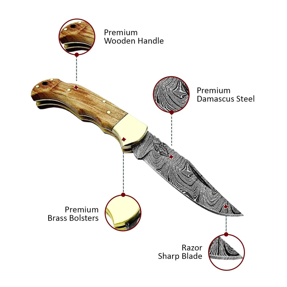 RAZOR SHARP CLIP POINT BLADE - BUFFALO HORN A PRECIOUS 100% HAND MADE DAMASCUS STEEL POCKET KNIFEReal Buffalo Horns unique piece of art made by ! Manufactured of 100% Real BUFFALO HORN, STAG or RAM HORN, CAMEL BONE or premium OLIVE WOOD, ROSE WOOD, BLUE WOOD, GREEN WOOD, MICARTA or MULTI WOOD, this exquisite Damascus steel makes a unique handmade folding pocket knife you will be proud of! CONVENIENT CARRY - AN EXCELLENT BEAUTIFUL BUFFALO HORN BEST QUALITY DAMASCUS STEEL YOU ENJOY WITH ALL YOUR SENSESFeast your eyes on the classy: Design of this elegant Custom handmade Damascus Steel Pocket Folding knife! Feel its sleek texture with your hand and enjoy its lightweight, compact shape in your pocket! Enrich your collection with a priceless Gift of art and enjoy the touch of style it offers! You always keep with you Good for Hunting, Fishing, Camping, Tactical, Survival, Hiking A BEAUTIFULLY HAND FORGED PIECE OF ARTWith a Damascus STEEL BLADE nicely hand forged with above (276) layers combining (1095) and (15N20) high carbon steel and Low Carbon steel with a durable nickel layer, our steel Blade has been given excellent heat treatment to get a (58to60) HRC, ensuring top functionality and guaranteed longevity.& You always keep with you Buffalo Horn Pocket Knife Good for Hunting, Fishing, Camping, Tactical, Survival, Hiking, and all Outdoors & Sports activities. THE 100% GENUINE BROWN COW LEATHER SHEATH:The pure leather sheath of this amazing Damascus steel Folding pocket knives is made of 100% prime quality thick cow skin to ensure excellent manufacture. The durable double stitching with the strong thick threads, in combination with the elegant, rust-resistant brass button make a high-standard leather knife sheath to host safely your precious Damascus steel.
