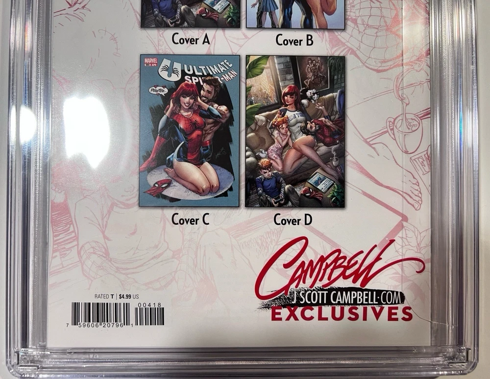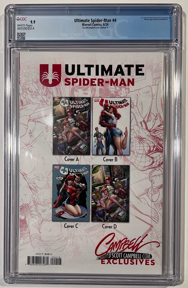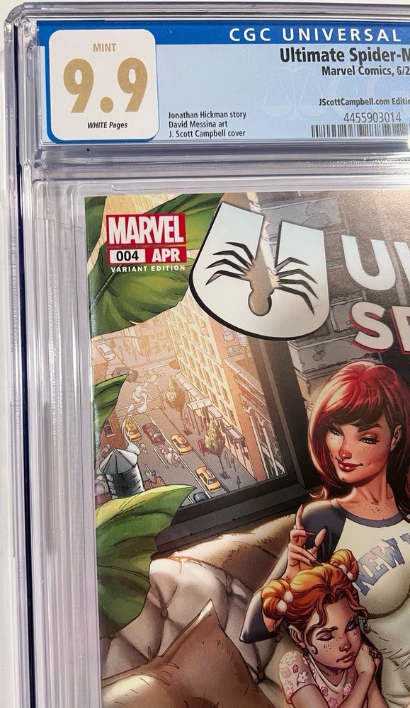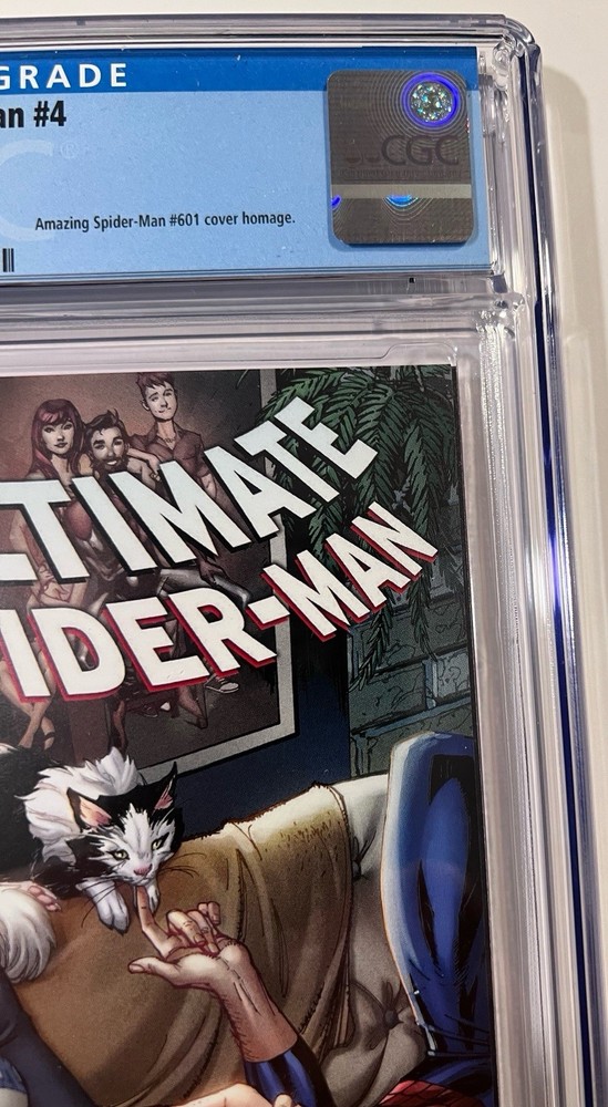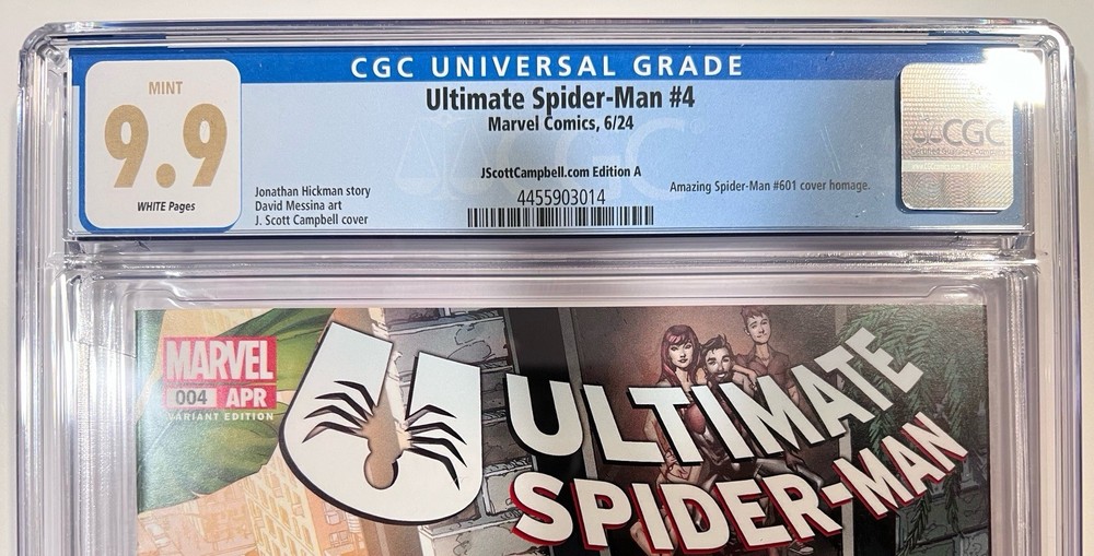 The Ultimate Spider-Man #4 CGC MINT 9.9 comic book from JScottCampbell.com features a special Spider-Man #601 Homage cover by artist J. Scott Campbell. This single issue variant cover is part of the US Comics tradition and is professionally graded by Certified Guaranty Company (CGC). With a colorful action-packed story and featuring popular characters like Mary Jane Watson, Spider-Man (Peter Parker), and Spider-Man (Miles Morales), this comic is a must-have for any superhero fan or collector. The Homage Cover and Variant features add to the appeal of this modern age comic from Marvel Comics.