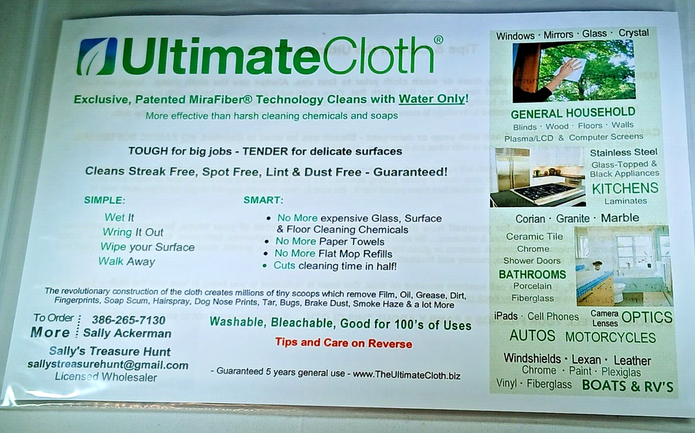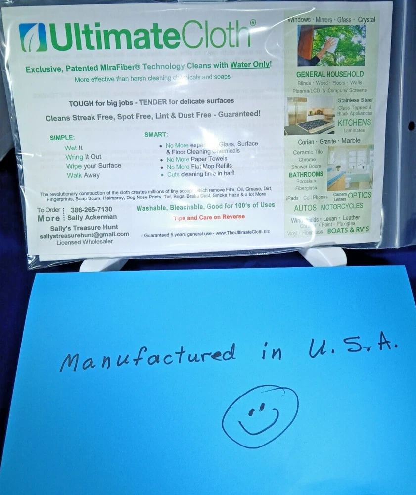 The Ultimate Cloth offers streak-free cleaning with water only, making it a convenient and eco-friendly option for various cleaning tasks. Made from MiraFiber material, this reusable cloth measures 15 inches in length and 13 inches in width, providing ample coverage for efficient cleaning. This white cloth is suitable for use in various cleaning tasks in and around the home. Manufactured in the United States, The Ultimate Cloth is a durable, bleachable and effective cleaning tool that helps maintain a clean with water only and tidy living space. Simply rinse well and wring out well and continue cleaning. Check out this seller's other listings. In addition the cloth for 1/$7, 2/$12, 5/$25, 10/$48 in numerous other listings. Your satisfaction is guaranteed on the purchase of the Ultimate Cloth or your money back. Manufactured in U.S.A. Also available in a 4-color pack for $20 also. Check out the seller's other listings for a variety of items.