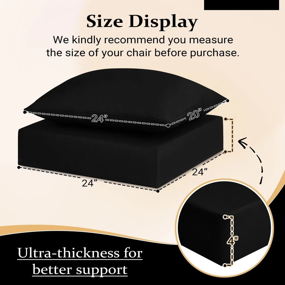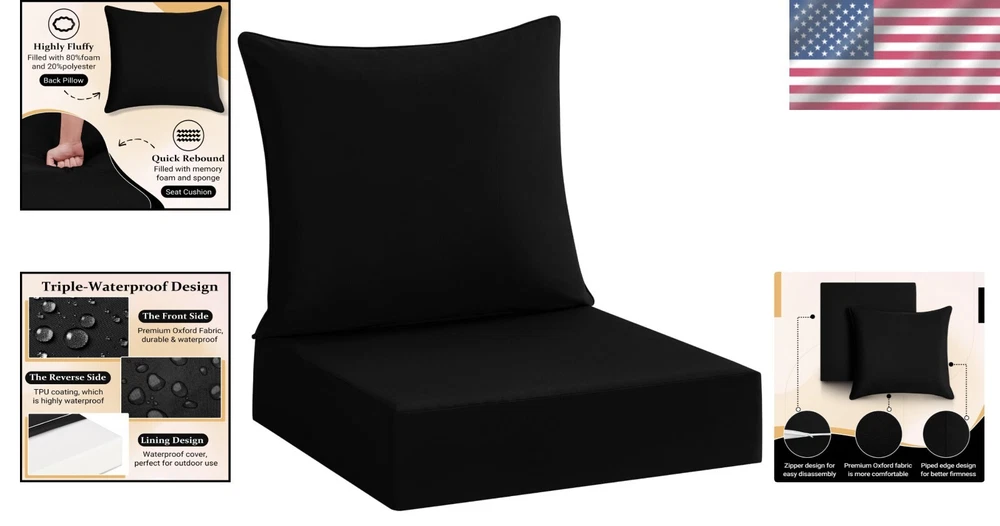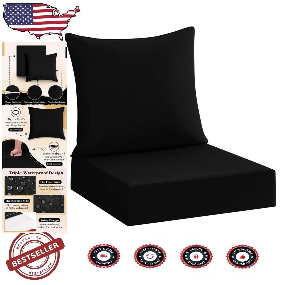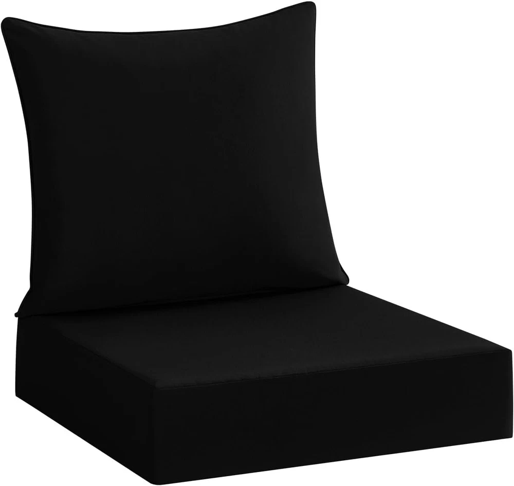 Number Of Items: 1 Assembly Status: Fully Assembled Material: Polyester, Oxford fabric, TPU coating, Lining design FSC Certified: No Age Range (description): Adult Color: Black Fill Material: Memory Foam Shape: Square Material Feature: Durable Set Includes: Seat Cushion & Back Pillow, Seat Cushion, Back Pillow gtin13: Does not apply Style: Outdoor Type: Cushion Set Occasion: Outdoor Pattern: Solid Cushions Included: Yes Cover Material: Polyester Cushion Color: Black Theme: Outdoor Assembly Required: No Closure Type: Zipper Number of Items in Set: Two-Piece Special Feature: Bagged Unit Count: 1.0 Count Indoor/outdoor Usage: Outdoor Recommended Uses For Product: Outdoor Personalized: No Features: Waterproof, Water-Resistant, Easy Care, Removable Cover Chair Color: Black Size: 2 Count (pack Of 1) UPC: Does not apply Department: Adults Product Dimensions: 24"l X 24"w Umbrella Included: No Fabric Type: 20% Polyester,80% Foam Item Weight: 8.49 lb Brand: Unbranded Pillow Type: Furniture Cushion