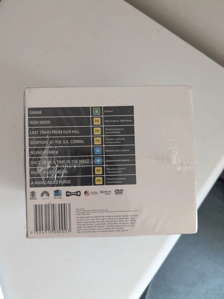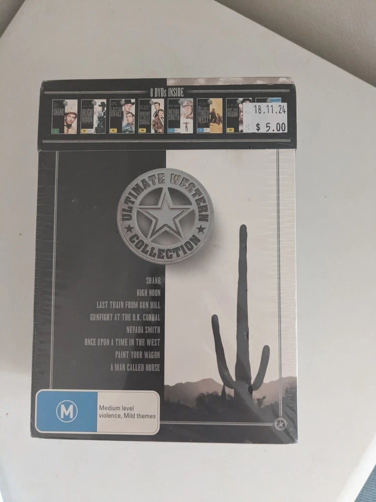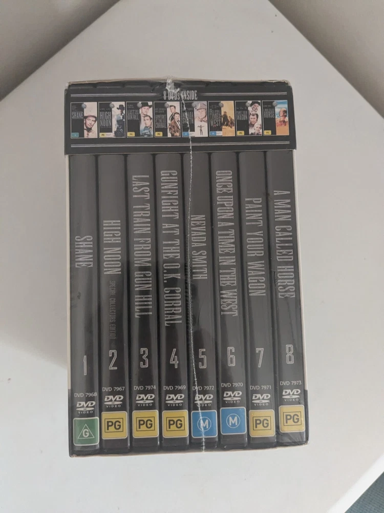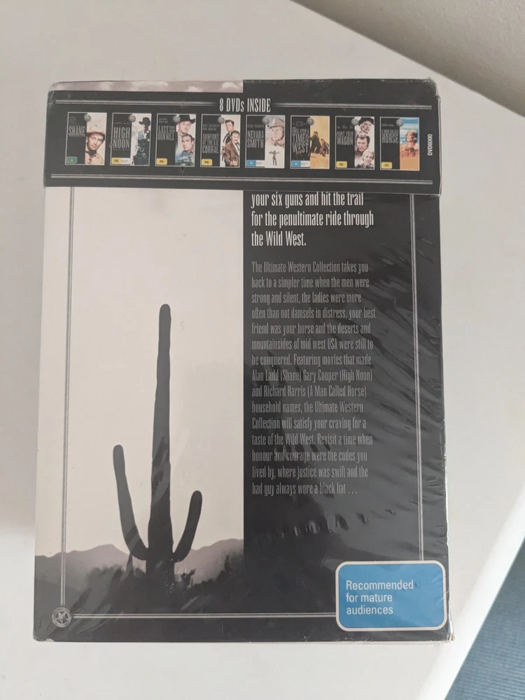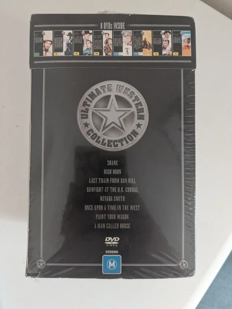 Little bit of wear on the corner where the shrink wrap has come off Get ready to immerse yourself in the wild west with the Ultimate Western Collection 8 DVD Box Set. This brand new sealed box set includes 8 DVDs featuring classic Western films, perfect for any fan of the genre. With a PAL video format and Region Code 4 compatibility (AU, NZ, Latin America...), this box set is a must-have addition to any movie collection. Grab your popcorn and enjoy a marathon of Westerns with this comprehensive box set.