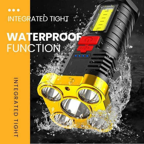 Multifunction Powerful 4 Head LED Waterproof Outdoor Camping Flashlight. This is not an ordinary flashlight. It has 4 LED lightbulb built in to provide an Ultra powerful light beam. It is waterproof and perfect to bring it along with you outdoor. It's unique design with the side lamp can turn this flashlight into a standup lamp for reading at night or simply use it as a camping lantern. Powerful lamp beads can produce up to 100,000 lumens of ultra-high-output, 40 times more than ordinary incandescent lights Size: Approximately 5.1" x 1.96". Small and compact. Easy to carry around. Each charge can last up to 2 to 3 hours of usage time. USB Charging and Indicator Light: Real-time power display (25%/50%/75%/100%) to keep track of battery power and charging status. Battery Capacity 18650mAh (Built-in battery) low lumen lamp beads Power:5W Voltage:3.1V Weight: Approximately 0.4 to 0.5 lb.