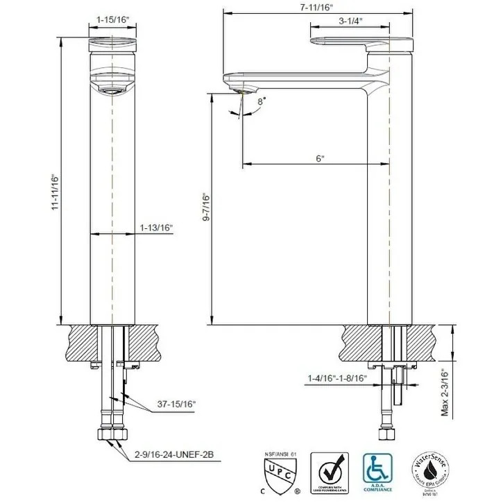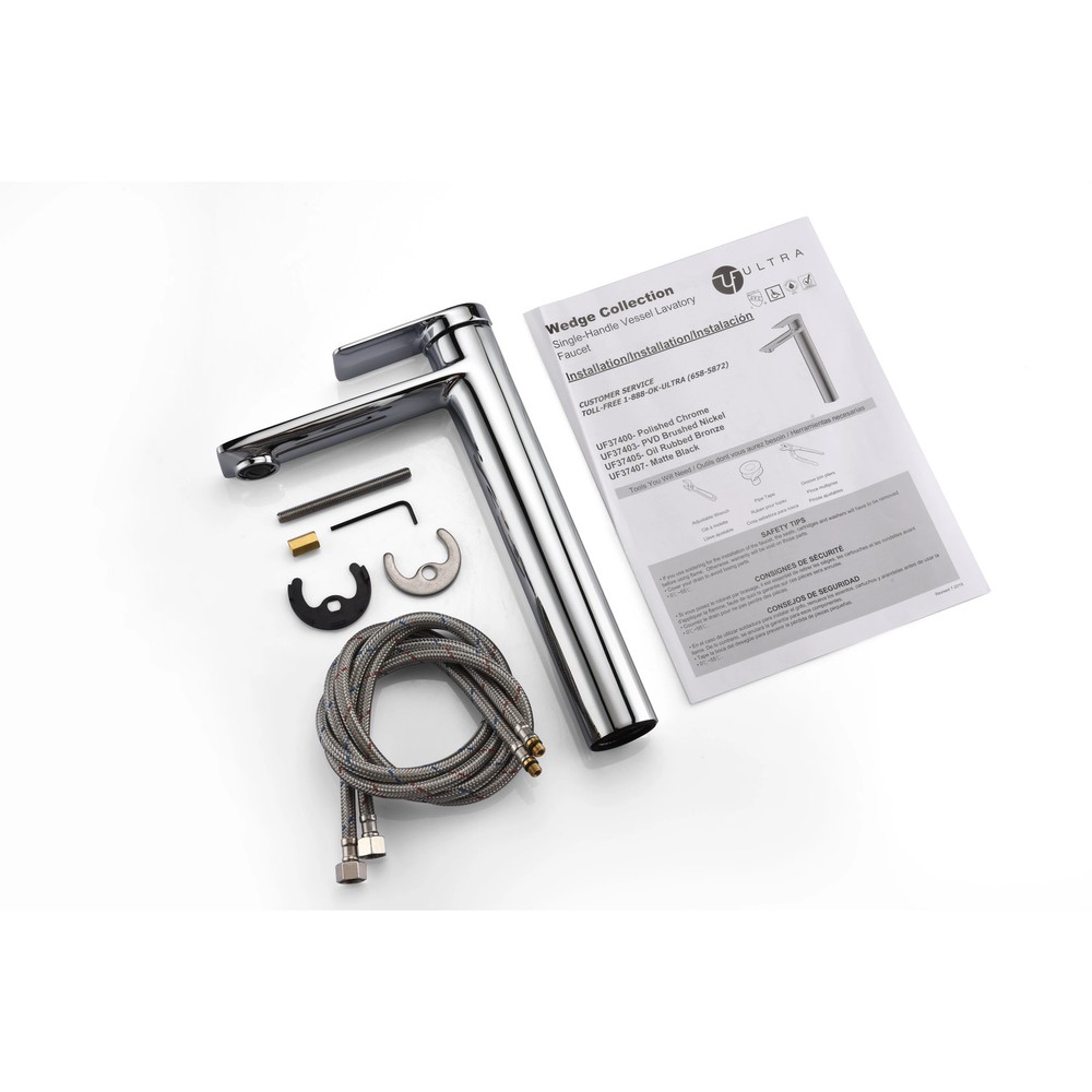 1 hole installation, without optional deck plate included Yizhan 35mm ceramic cartridge Pop-up Drain not included Lead free metal body and Zinc handle 30" flexible stainless steel inlet hose with 3/8" compression fitting Neoperl aerator 1.2gpm max @ 60psi Free Shipping Over $49.99* Details Ultra Faucets Wedge Collection Single Handle Vessel Lavatory Faucet Product Description: 1 hole installation, without optional deck plate included Yizhan 35mm ceramic cartridge Pop-up Drain not included Lead free metal body and Zinc handle 30" flexible stainless steel inlet hose with 3/8" compression fitting Neoperl aerator 1.2gpm max @ 60psi