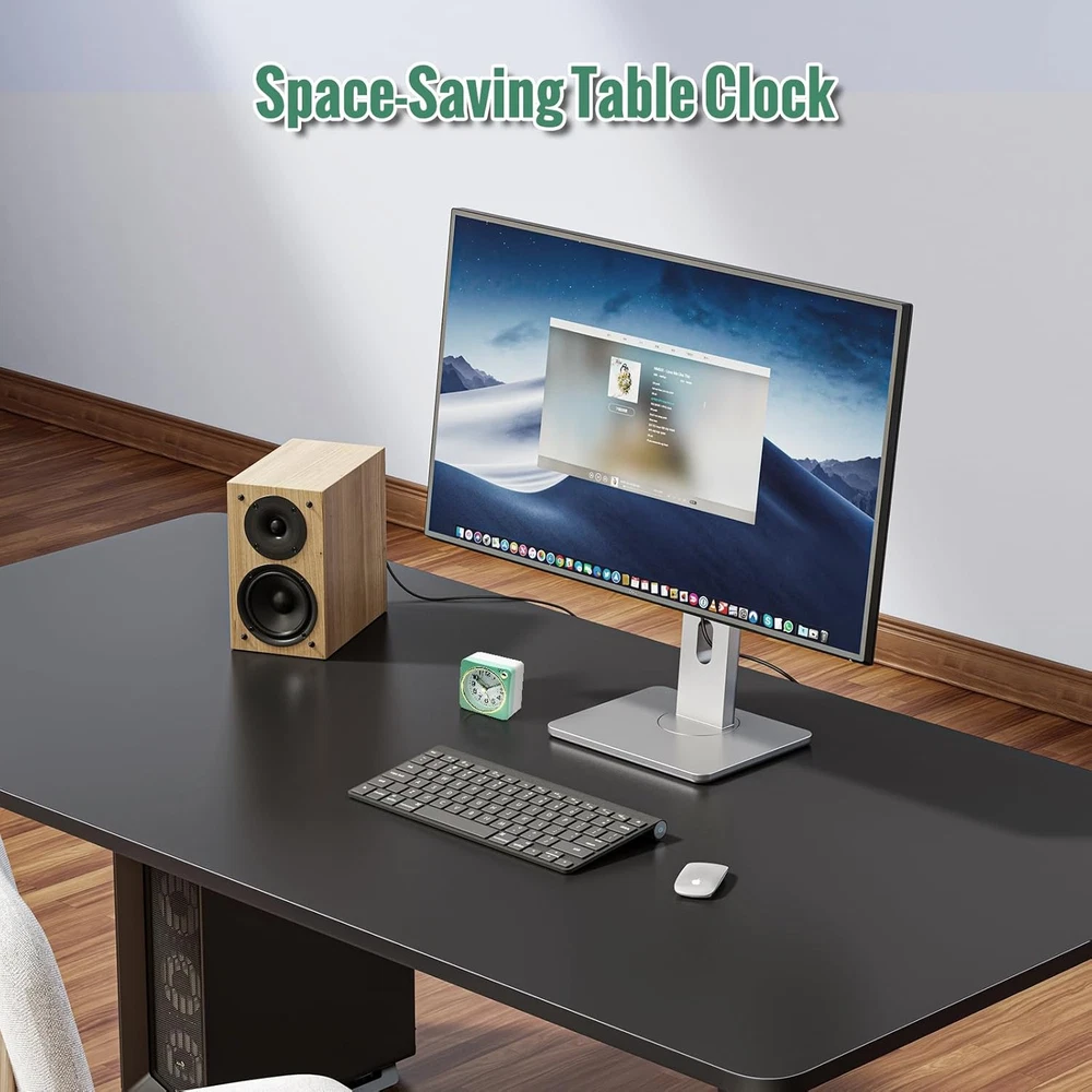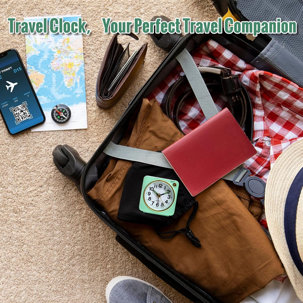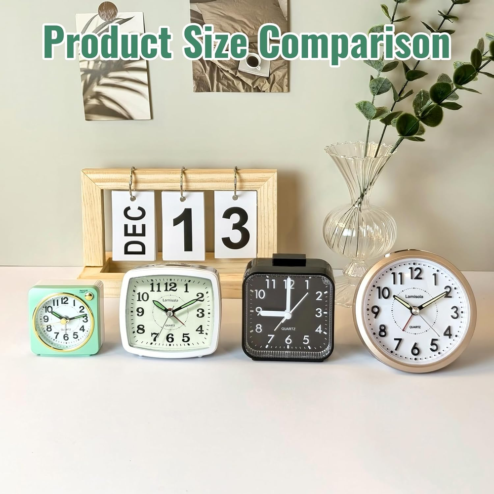 Ultra Small Alarm Clock: The small analog clock keeps perfect time. It's light- weighted, functional, easy to handle, compact, pretty, silent. The size is 2.4" x 1.3" x 2.4" , The mini size makes it perfect as a travel clock, it's easy to packed in your suitcase, pocket or bags. The little alarm clock is lightweight take up small place. Silent Clock: The quartz clock's hands sweep silently and smoothly, ensuring it won't disturb your sleep. You could put it on desk table shelf night stand end table kitchen counter bathroom shelves . Backlight On Demand: The light switch is on the front of the alarm clock, so you can press it without fumbling around when you’re half asleep. The light makes it easy to check the time at night. Assending Alarm: The gradually increasing alarm volume gently wakes you up in the morning, while the final loud and urgent ring ensures you never oversleep. The alarm clock is perfect even for heavy sleepers. Retro Design: With its vintage design and vibrant colors, it’s strikingly beautiful and works perfectly as home decor — adding a splash of color to your desk. Finally Yet Importantly: The clock is a perfect fit for the bedroom office desk living room bathroom child's room or nursery, wherever you need clear, accessible time. It suits for seniors and the elderly teenagers and adults children and kids making it a thoughtful gift for the whole family. Product description Lamisola Mini Travel Desk Analog Clock Chic small desk home decor clock This chic alarm clock isn't just functional—it's a stylish accessory. Its modern design adds a beautiful pop of color to any desk, making it the perfect decorative piece for your home or office. Multi-Function Portable Clock With its compact and durable design, this alarm clock is perfect for home use, travel, picnics, and adventures. Easily fits in your backpack or suitcase, ensuring you wake on time anywhere—from your bedroom to a campsite under the stars. Light On Demand Press the front button, you can get temporary light to read time at dark, which is very useful. Slient The quartz clock goes quiet, no ticking noise, slient for sleeping. Snooze Press the front button, you can get extra 8 min snooze. Battery operated The clock is powered by 1 AA battery, cordless, easy to take away.
