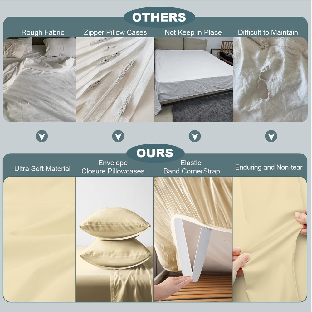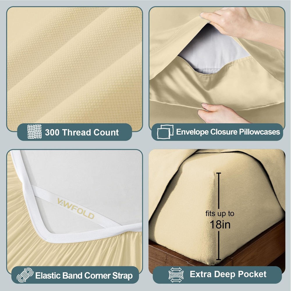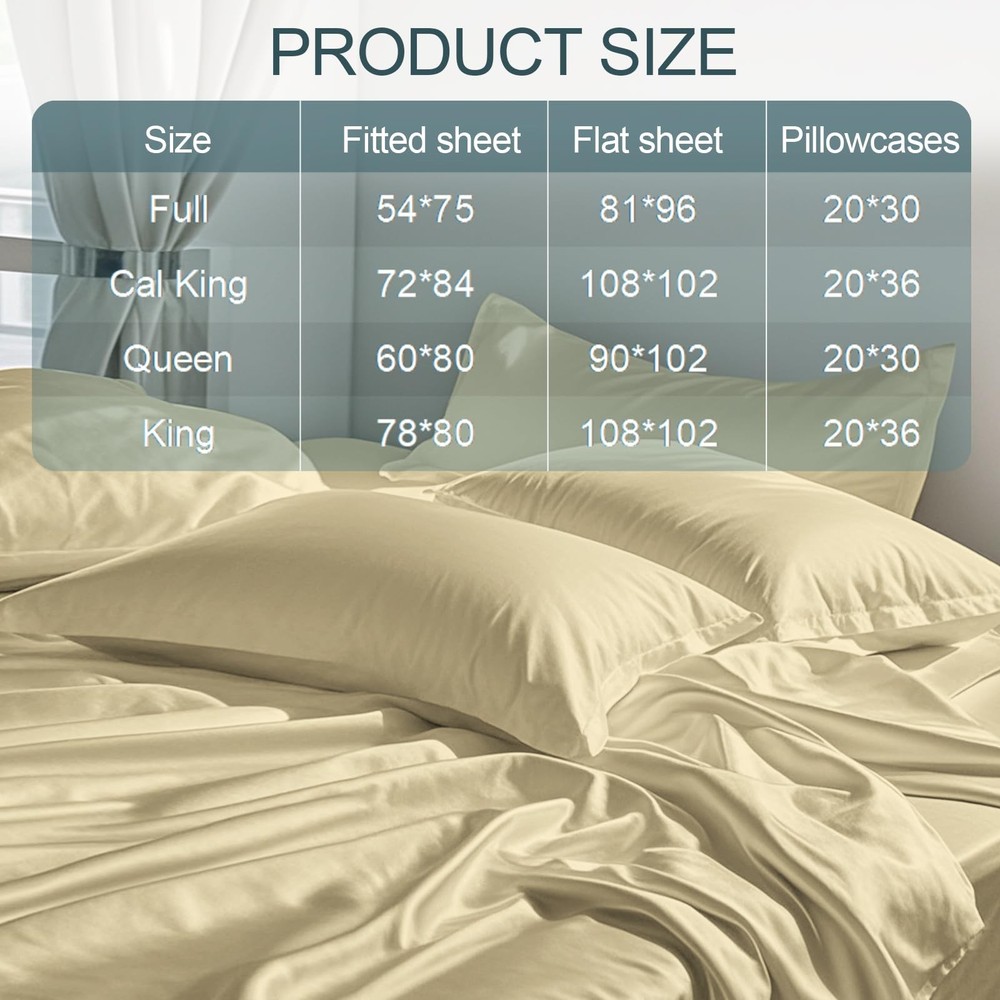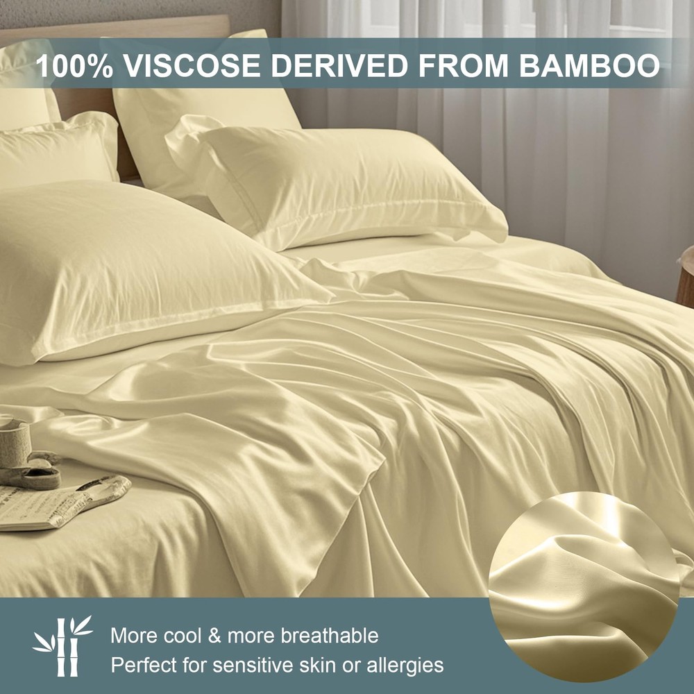 Pillow Cases 2 Pack, Fitted Sheet 1 Pack, Flat Sheet 1 Pack. Imported 100% Viscose Derived from Bamboo 【Embrace Nature, Enjoy Purity】 Full sheets, purely made from 100% viscose made from bamboo, offers unique breathability and a cool touch, Crafted with a 300-thread count, it provides a soft and delicate experience that grows softer after each wash. Durable and tear-resistant. 【Focus on Details, Texture Your Life】 The 360-degree full elastic band and reinforced 4 corner straps ensure perfect fitting every day, highlighting life's quality in the details. 【High-end Quality, Trustworthy and Responsible】 cooling sheets, rigorously certified by OEKO-TEX Standard 100, ensures a substance-free environment, guarding your every peaceful night. Our commitment is to offer you environmental integrity, and high quality.