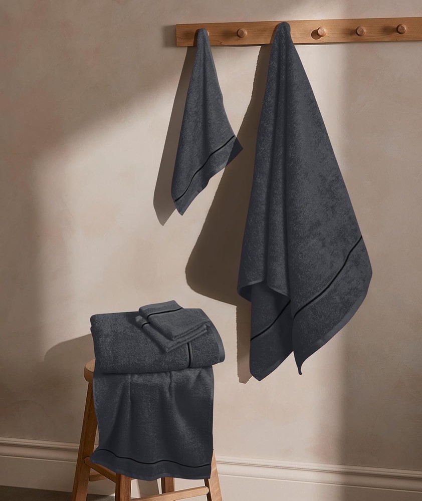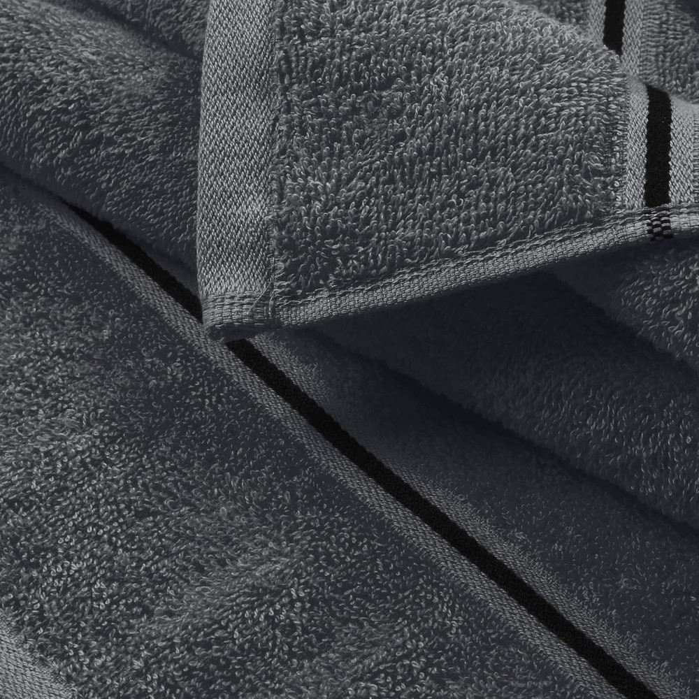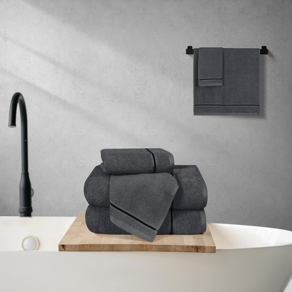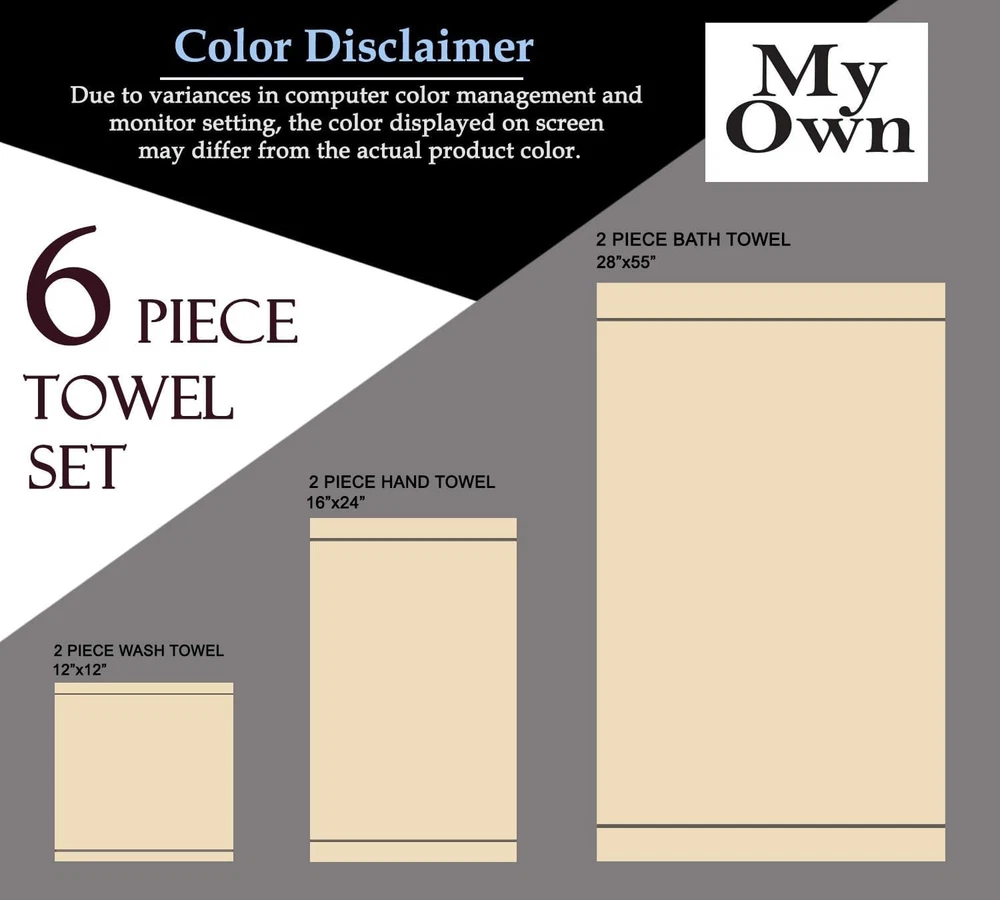 Ultra Soft 6 Pack Cotton Towel Set, Contains 2 6 Piece Charcoal Grey Product Details Color: Charcoal Grey Brand: MyOwn Age Range (Description): All Ages Material: Cotton Product Dimensions: 55"L x 28"W Number of Items: 6 Pattern: Bordered Special Feature: Bagless Product Care Instructions: Machine Wash Shape: Rectangular Size: 6 Piece Set Unit Count: 6.0 Count Fabric Type: 100% Cotton Customer Package Type: [POSSIBLE] FFP Manufacturer: MyOwn Target Audience: All Individuals Item Weight: 2.02 pounds Item model number: 71491 Each set contains 2 oversized bath towels 28x55 inches, 2 hand towels 16x24 inches & 2 wash cloths 12x12 inches 100% Pure cotton for softness, absorbency & durability - Outdoor Lightweight Quick Dry Towel Set Complimented set for daily use, hotel & spa, quick drying & multipurpose usage 100% Natural materials & free from harmful chemicals / materials - safe for you & your family Machine washable & dryable, wash in cold water, tumble dry low - wash separately before first use MyOwn cotton towel sets is a beautiful and carefully crafted product with lot of attention to details. Basic towel, quality product, low cost, everyday use, soft feel and high absorbant. Eco friendly. Its less weight help to consume less water in washing, less energy in drying, less detergent for laundry. Sustainable product without compromising on the comfort and style. Made in a state of the art vertically integrated facility.