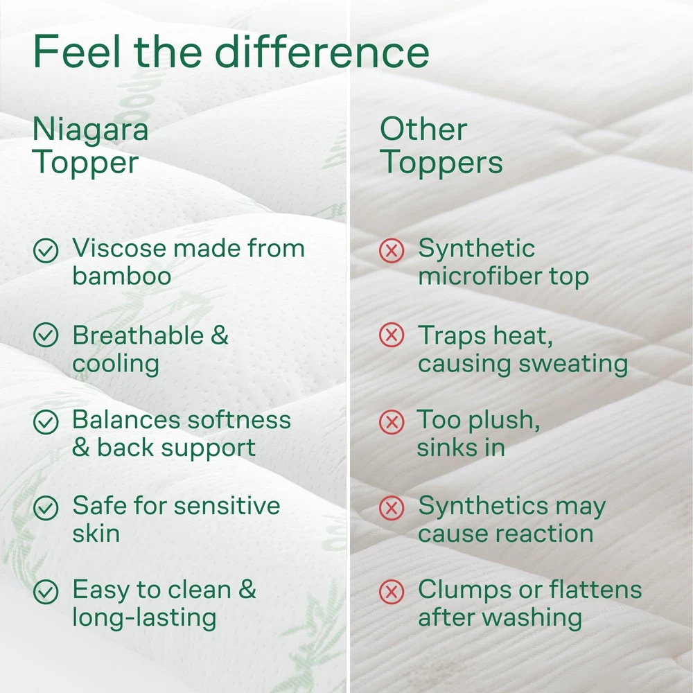 Viscose made from Bamboo Full Mattress Topper - Thick Cooling Breathable Pillow Top Mattress Pad for Back Pain Relief - Deep Pocket Topper Fits 8-20 Inches Mattress ULTRA SOFT: Niagara Cooling Mattress is made from viscose made from bamboo fiber and fits mattresses 8-20 inches deep. This cooling pad for bed gentle on sensitive skin, elastic, and ultra-soft in touch. ENHANCE YOUR MATTRESS: This full size padded mattress topper brings 5-star hotel quality to your bedroom. The mattress topper firm is 54x75 inches in size, comfortable, and breathable. CLOUD-LIKE SLEEP: Our cooling bed pad adds an extra cushion to potentially ease back pain. The organic mattress topper is cool, sweat-absorbent, and has no harsh chemicals like latex or formaldehyde. EASY TO USE: Our active cooling mattress topper has a deep pocket and has stretchy sides to help put on thick mattresses. The hard mattress topper is machine-washable and dries fluffy, so bedsheets won’t slide off. SATISFACTION: Get 100% satisfaction with the best price mattress topper. Our pull out mattress topper has a money-back guarantee. Enjoy sound sleep today with a hard topper!