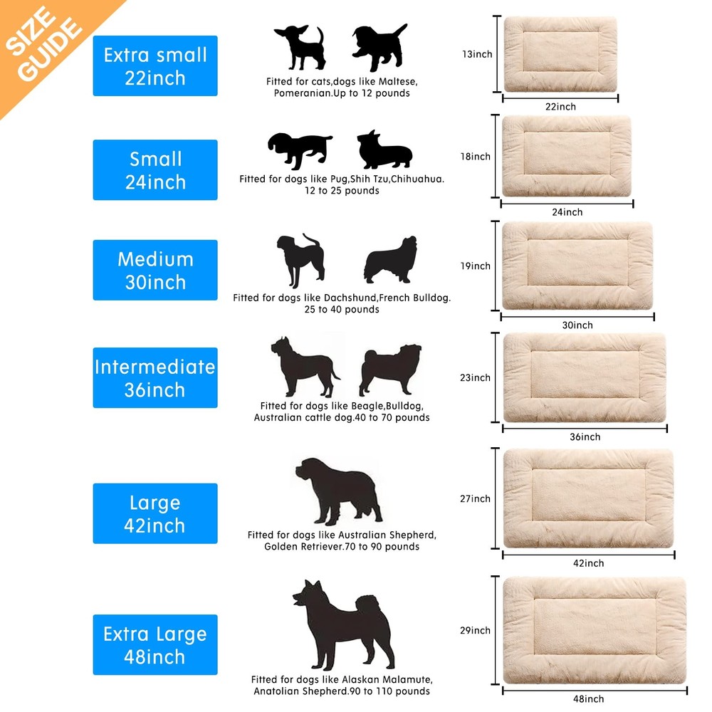 super soft dog bed easy clean crate pad comfortable kennel mat fitted size pet love for large/medium/small size dog SIZE GUIDE: Ideal dog bed for wire dog crates.This pad measures approximately 22inch*13inch.Fit for cats,dogs weighing up to 12 pounds such as Maltese,Pomeranian,Yorkshire Terrier. ULTRA SOFT SURFACE: Adopt super soft faux fur material to provide your pets a comfortable sleeping experinence.This dog pad can also help them ease anxiety and protect their joint well. EASY CARE: You can totally wash this dog bed by machine under moderate mode and dry it by dryer under low temperature or in the sun.It can remain shape well after times wash.This crate pad also has anti-slip bottom which can protect your pets well when they step on or off it. MULTI USE: This Pet bed can be uesd as a crate bed,kennel bed,cage bed,dog pillow,dog cushion and can be used in any place you need to protect your baby dog,no matter outdoor or indoor.It's also suitable for all seasons.Make your pets have a comfortable and homelike bed any time. AFTER SALES SERVICE: Please contact me if you feel uncontented with the pad and I will try my best to help you solve any problem.Also,remember to shake and pat it to help the mat restore its fluffiness since it is arrived in a sealed package.Washing and drying before use will make it become more comfortable.
