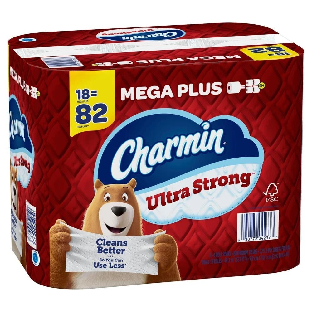 Ultra Strong Toilet Paper Rolls (18 Mega plus Rolls) Get sparkly clean with Charmin Ultra Strong. It's 4X stronger when wet and has a diamond weave texture. It's woven like a washcloth and holds up when you wipe. It even cleans better so you can use less and go longer without changing the roll. We also made it MEGA PLUS in size, so you get mega value. That's right, our Charmin Ultra Strong Mega Plus Roll is way bigger and more bang for your behind so you'll be running back to the store less and less (based on number of sheets in Charmin Regular Roll bath tissue). Our Charmin Ultra Strong toilet paper is also 2-ply and designed to be clog-safe and septic-safe so you can flush confidentially and keep clean. We all go, why not Enjoy The Go with America's favorite toilet paper. Verses leading USA 1-ply bargain brand verses Charmin Regular Roll Charmin Brand based on sales. Source: Nielsen 2021 dollar sales. Pack contains 18 mega plus rolls (275 sheets per roll) of Charmin ultra strong toilet paper Charmin ultra strong has washcloth like texture 4X stronger when wet to keep your hands and hiney clean (verses leading USA 1-ply bargain brand) Made with a diamond weave texture Clog-safe and septic-safe, roto-rooter approved Cleans better with fewer sheets and less effort (verses leading USA 1-ply bargain brand) Bigger packs last longer vs. smaller count pack of mega plus roll Cleans better so you can use less (verses the leading USA 1-ply bargain brand)