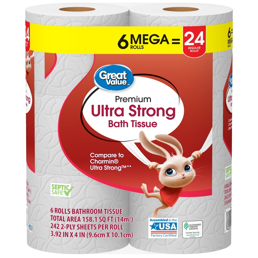 Ultra Strong Toilet Paper features 2-ply sheets of toilet paper that are super strong and absorbent making them the perfect solution for your family. This toilet paper has the perfect combination of strength and luxurious softness that you have been looking for allowing you to get the job done without needing a large amount of paper in a single use. TThis pack comes with 6 mega rolls, so you get four times the sheets of regular rolls, meaning you won't have to buy toilet paper as often. Each long lasting roll has a stylish embossed texture that adds to the beauty of any bathroom. The rolls come in smartly sized bundles that are easy and convenient to store in home or in workplaces. Bring home the Ultra Strong Premium Toilet Paper. 6 Mega Rolls = 24 regular rolls Each roll has 242 sheets of 2-ply bath tissue Sheet size is 4" x 4" totaling 161.3 square feet Pack sizes available: 6 Mega Roll, 12 Mega Rolls, 18 Mega Rolls, 24 Mega Rolls and 30 Mega Rolls Bath Tissue is septic safe in well-maintained sewer and septic systems