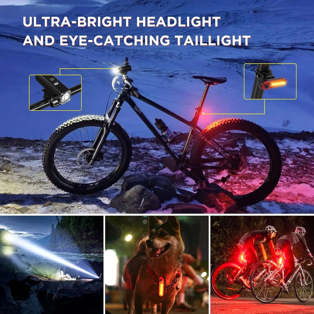 Super Bright Lighting: Equipped with high-power LED beads,providing up to 1200 lumens of brightness, ensuring clear visibility of the road ahead during nighttime cycling and improving safety. The running time of the headlights is 5-15 hours, and the running time of the taillights is 50-80 hours, which can meet your lighting needs for long-term cycling. High-Capacity Rechargeable Battery: Built in 8000mAh lithium battery, it supports USB fast charging and can be used continuously for several hours after being fully charged. It can also be used as a power bank to charge your smartphone,Ideal for riding outdoors. Easy to install and carry: The 360 ° adjustable bracket is suitable for most bicycle handlebars and can be quickly installed without tools. the lightweight and portable design also makes it easy to disassemble and carry,very suitable for mountain bikes and commuter bikes. Multiple Mode Options: The headlight and taillight with multiple lighting modes (high beam, medium beam, low beam, flash, slow flash, SOS) to meet different riding needs. easy to switch modes with simple button operations. in special circumstances, it can also be used as an emergency flashlight. Durable,Waterproof& Reliable Service: Made of high-quality aluminum alloy casing, it is very sturdy. IP65 waterproof design ensures normal operation even in rainy or harsh weather conditions.if you encounter any problems, our dedicated customer support team is always ready to assist you through Amazon's easy returns and quick solutions. Product Description