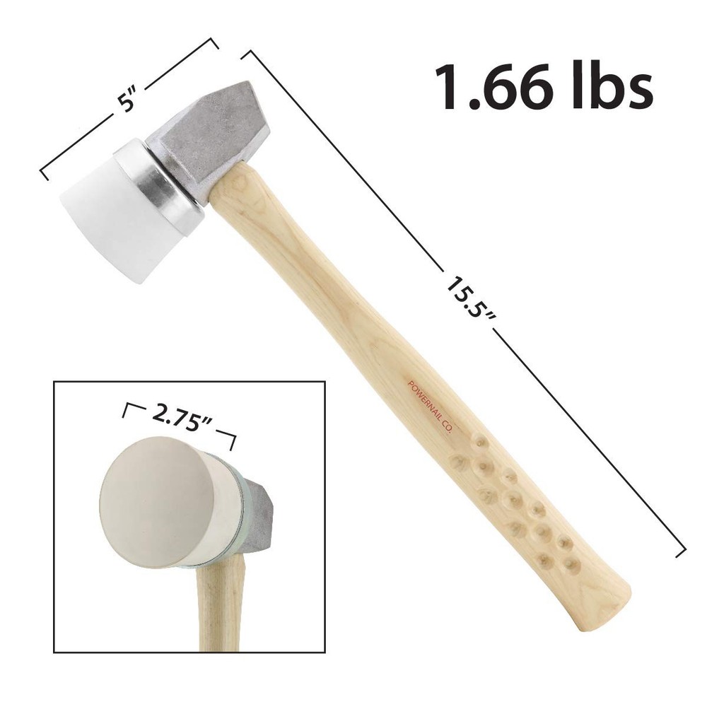 This is ’s all-new Aluminum White Rubber Mallet. Weighing only 1.7 lbs., this mallet is almost a full pound lighter than our traditional 3MI Iron Mallet. Its handle is Tennessee hickory and fluted for a slip-free grip. The white rubber cap is non-marring and long lasting. Opposite the cap is ’s signature wedge head design that allows you to join flooring boards without damaging the floor’s finished face. This mallet is compatible with any of ’s pneumatic flooring nailers and staplers and is a wonderful companion to any of ’s F-Series tools. Features light-weight aluminum wedge head Non-marring, white rubber cap Ultra-Light, weighs only 1.7 lbs. Tennessee Hickory handle is fluted for a slip-free grip Made in the USA