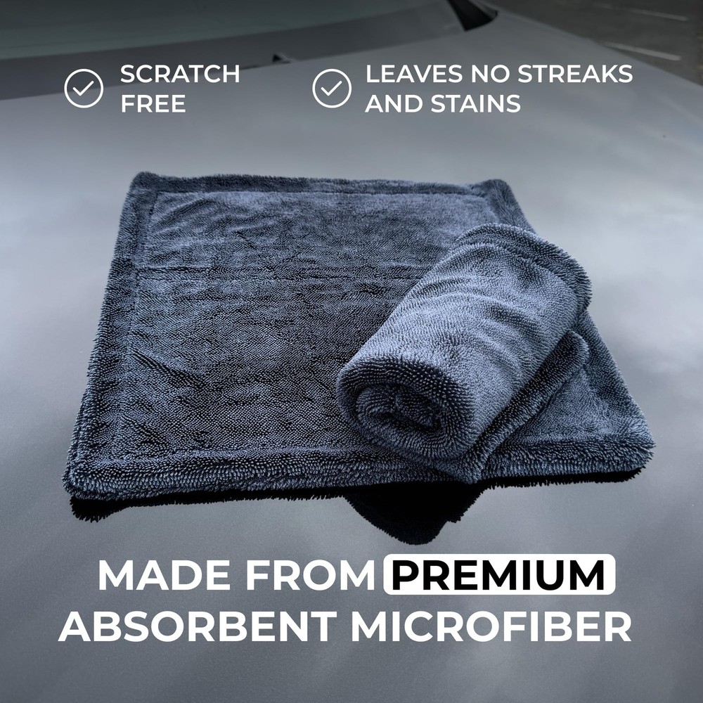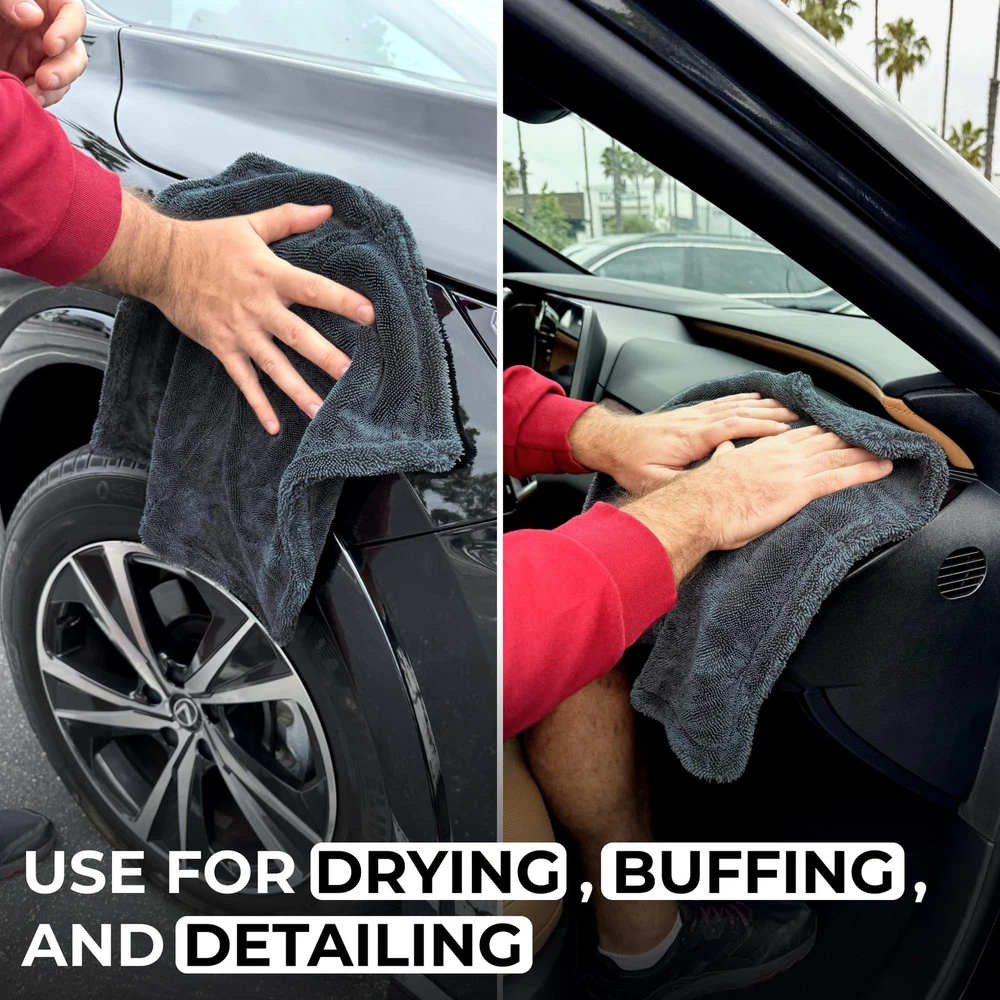 car drying towel for cars black pro 16x16 inches microfiber line wash woolly drying towel mammoth microfiber scratch big detailing drying towel black toallas para secar carros twisted loop drying towel line grey EXCEPTIONAL DRYING PERFORMANCE: Achieve streak-free and spotless results with this highly absorbent microfiber car drying towel. Its unique double-twist pile construction allows for quick and efficient drying, reducing the time it takes to dry your vehicle. SUPERIOR MICROFIBER QUALITY: Our drying towels for cars are crafted from ultra-fine and super absorbent microfiber fabric, this towel effortlessly removes spots and drops without scratching your vehicle's surface. The soft, invisible edges of the car wash drying towels ensure a gentle and safe cleaning experience. REUSABLE & MACHINE WASHABLE: Save time and money by reusing these car drying towels without the need for frequent laundering. Hang it to dry after use, and it's ready for your next cleaning task. MULTIPURPOSE: Besides vehicle drying, these microfiber drying towels for cars are perfect for cleaning car windows efficiently without leaving streaks or water residue. BUILT TO LAST: Designed for durability, 16x16 in microfiber towels for cars can withstand years of use. Its Twisted-Loop Microfiber Technology ensures maximum absorbency and surface coverage, making it an excellent investment for car enthusiasts and detailers.