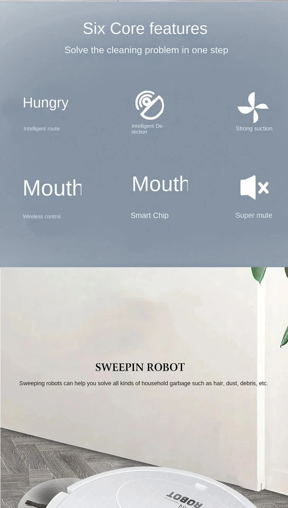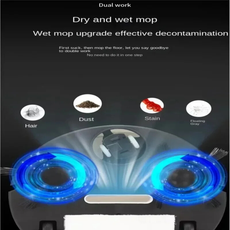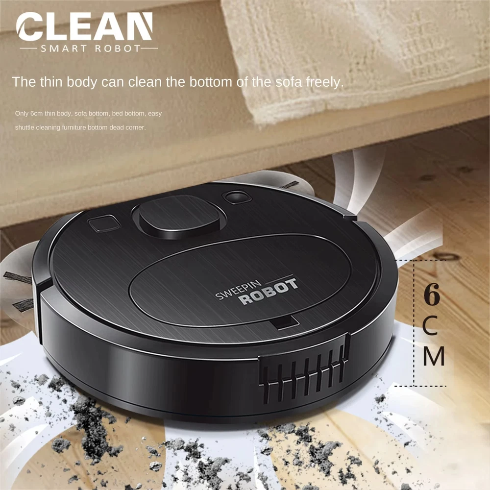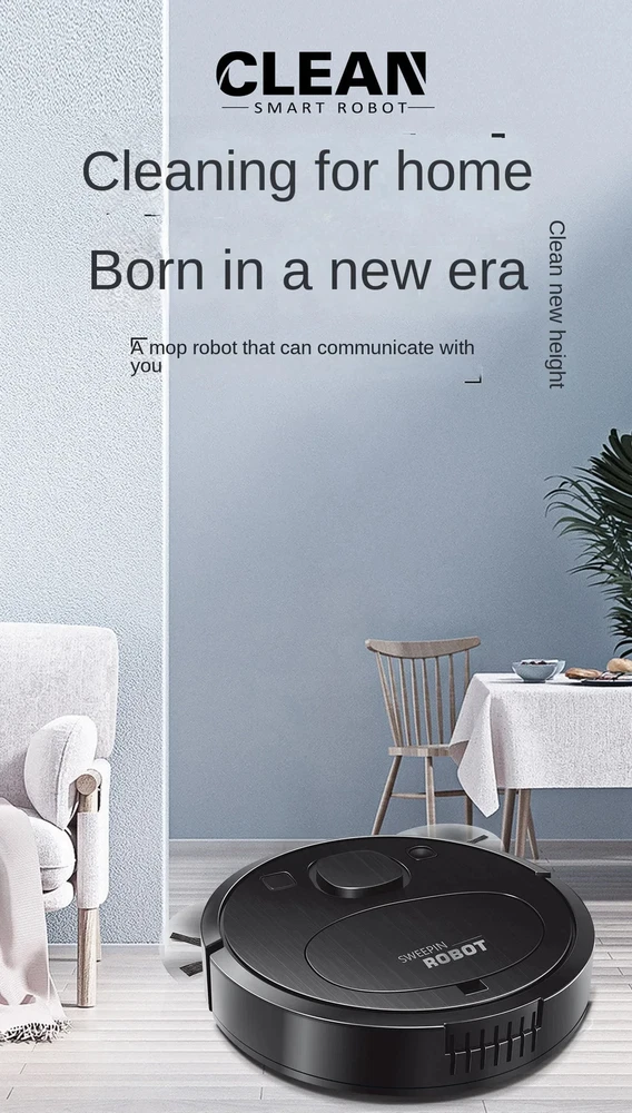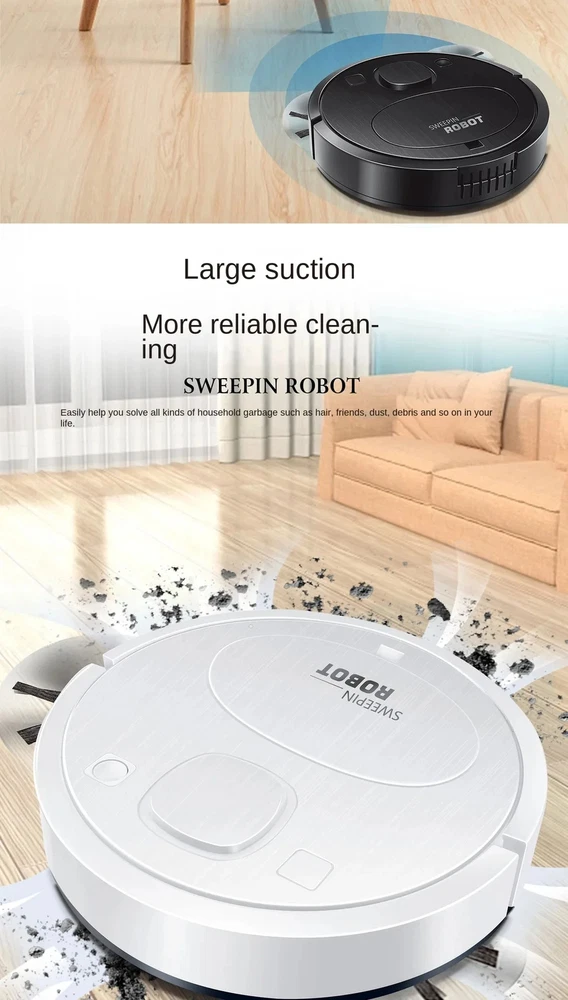 Smart Sweeping Floor Robot 9800pa Ultra-quiet Vacuum Cleaner Carpet Wireless Mopping Machine For Home Office Use Features: 1. Multifunctional sweeper: The sweeper has five functions: sweeping, mopping, vacuuming, humidifying, and purifying. It can efficiently clean dust and garbage on the ground, making your home clean and comfortable. 2. Strong suction, can go anywhere: The sweeper has super strong suction, easily absorbs stubborn dust on the ground, can travel in multiple directions, cleans large areas without dead corners, and is more efficient. 3. Ultra-thin body design: The 60mm ultra-thin body design can freely clean the bottom of wardrobes, sofas, beds and other furniture, making cleaning more comprehensive and thorough. 4. Use on multi-material floors: The sweeper is suitable for cleaning various smooth floors, such as marble, ceramic tiles, wooden floors, etc. Specifications: Material: PP Color: White/Black Number of motors: double motors Battery capacity: 2000mA Charging time: about 4-5 hour Usage time: about 60-120 minutes Operating voltage: 5V Suction: 1800PA Net weight: 2.25KG Product size: diameter 27*high 6 CM Packing: 39*31*9CM Packing List: 1* Sweeper 2* Extended brushes 1* cleaning cloth 1* Dust box cleaning brush 1* USB Charging Cable 1* User Manual